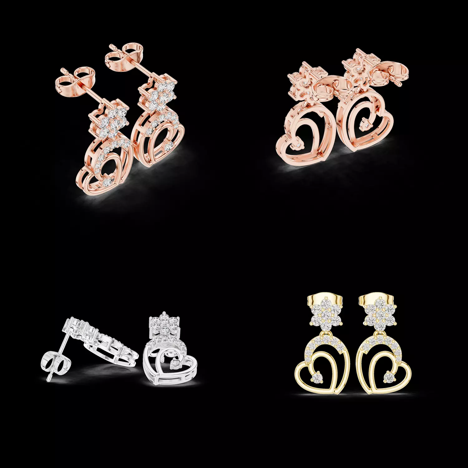 Professional jewellery CAD model for manufacturingRomantic heart-shaped drop earring designFloral diamond cluster stud sectionAccent diamonds for added brillianceClean geometry optimized for casting and productionOpen heart structure for lightweight designSecure prong settings for gemstone placementEditable CAD file for resizing and customization