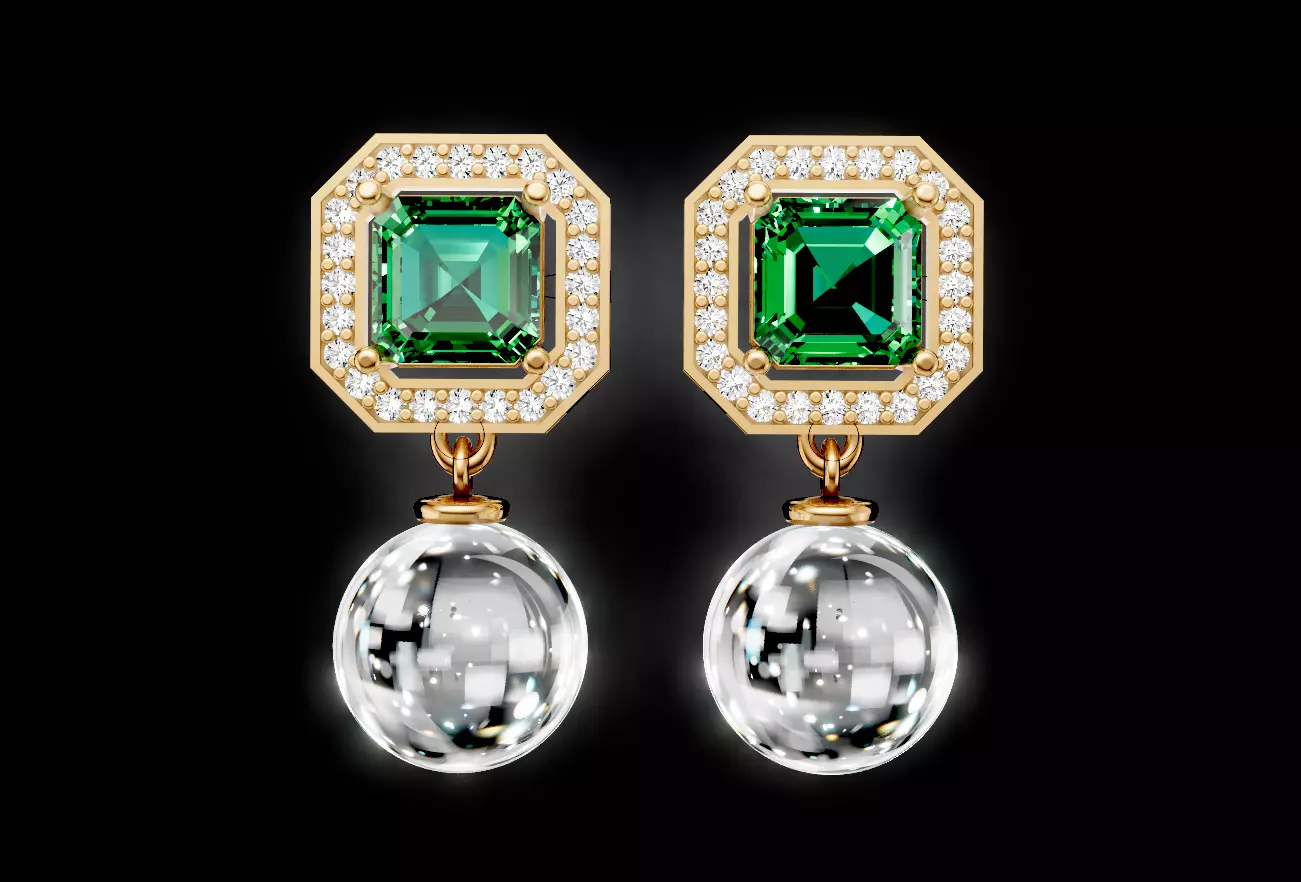 These luxurious Emerald Elegance Drop Earrings feature an octagonal design with a striking Asscher-cut green gemstone at the center, secured by four golden prongs. The gemstone is surrounded by a halo of brilliant round-cut diamonds, enhancing the sparkle and elegance of the piece.Dangling from the main stud is a transparent crystal orb, adding a modern and artistic touch to the design. The warm gold metal setting complements the vibrant green hue of the central gemstone, creating a timeless yet contemporary appeal.fell free to contact me for changes or more details.