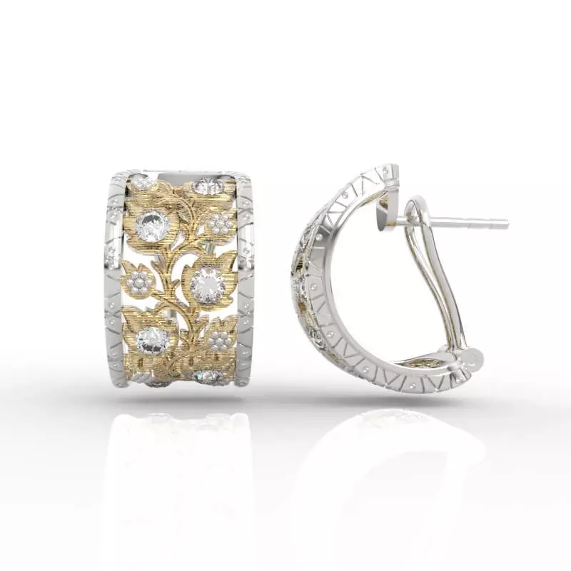 Metal Treatment: Sophisticated two-tone gold construction (yellow gold base with white gold accents)Surface Finishes: Multi-textural approach featuring:Brushed matte sections for subtle sophisticationMirror-polished highlights for brilliant contrastHand-engraved botanical relief workEdge Detail: Traditional rope twist borders adding classical refinementThe Wide Floral Hoop Earrings models showcase museum-quality botanical engraving that transforms precious metal into living art. Your discerning clientele will appreciate the tactile richness and visual complexity that speaks to generations of European goldsmithing tradition.
