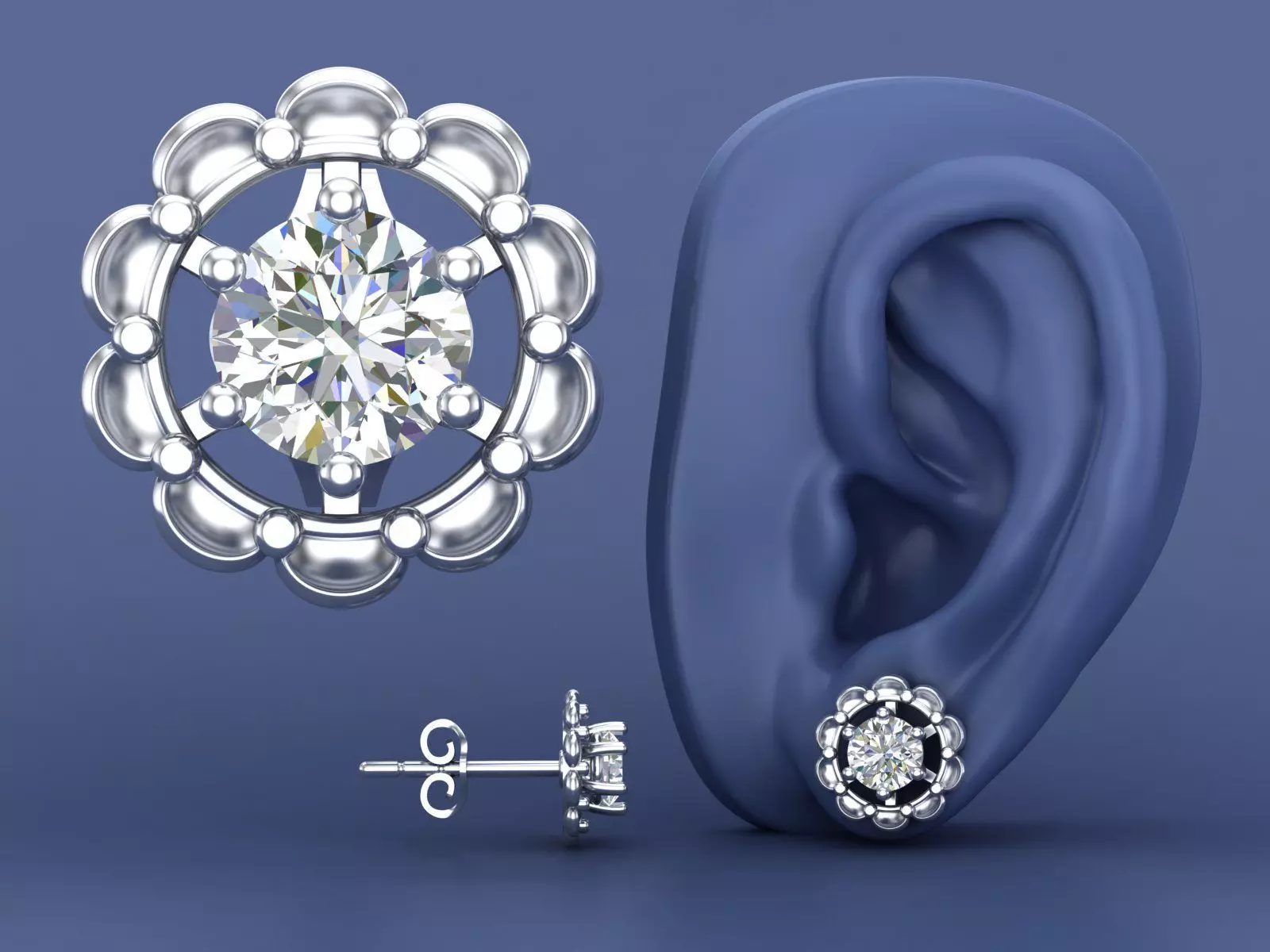 Floral Halo Round 5mm Stone Stud Earring (Production‑Ready)A high‑detail 3D CAD stud earring featuring a brilliant round center stone framed by a scalloped floral/rosette halo. The design blends classic solitaire proportions with a decorative bead-and-petal outer gallery, creating strong light return and a refined vintage-inspired look. Shown as a post stud with a secure setting suitable for fine jewelry manufacturing.