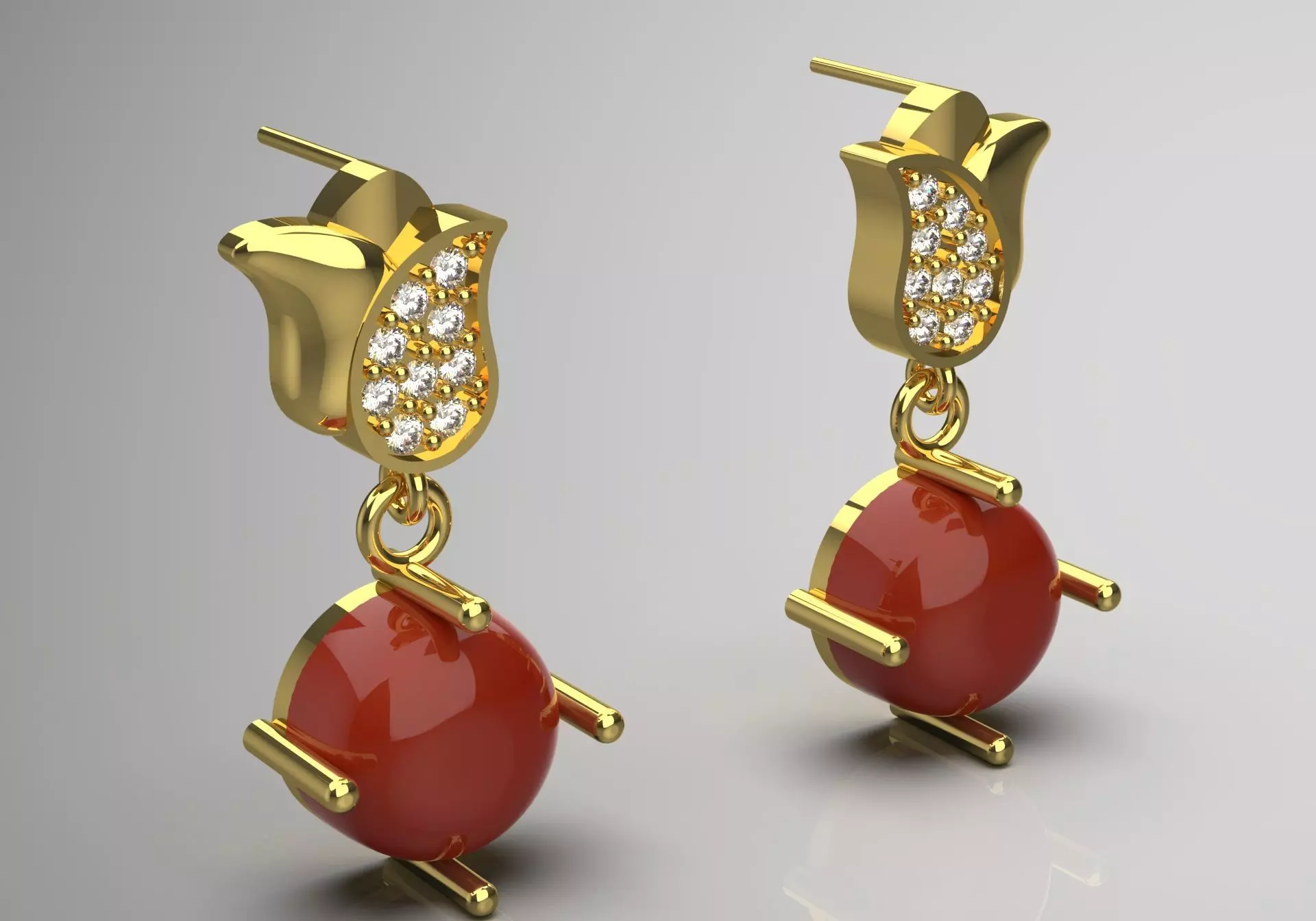 Beautifully suspended from the stud is a large, lustrous coral red gemstone that is perfectly shaped into a semi-circular sphere. This bold color contrast beautifully contrasts against the warm tones of the yellow gold, creating a vibrant and dynamic visual appeal.