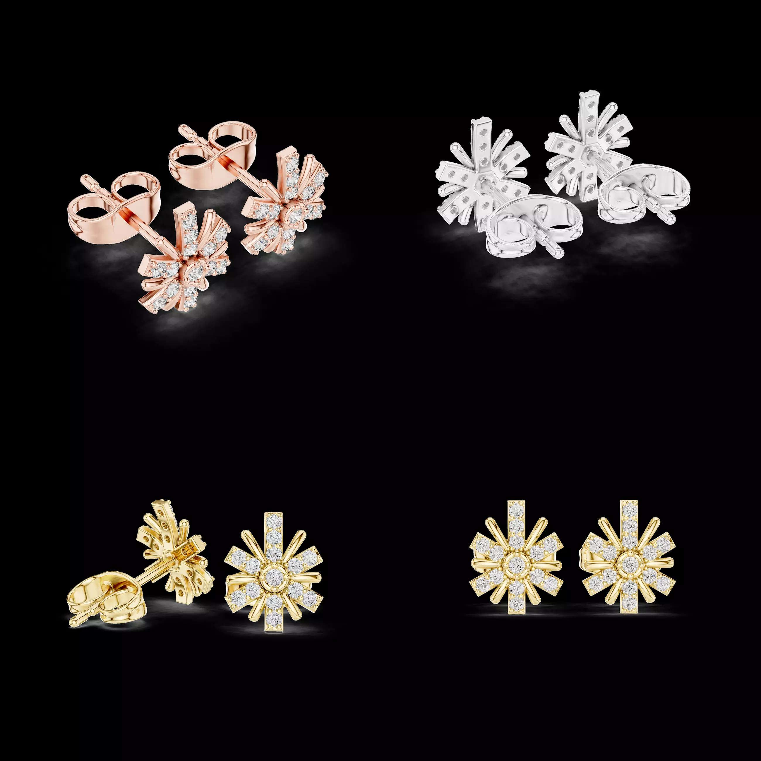 This product is a professional 3D CAD jewelry model of geometric starburst stud earrings, created for real manufacturing and production workflows. The design features bold radial bars with precisely placed stones, forming a modern architectural look suitable for contemporary fine jewelry collections.