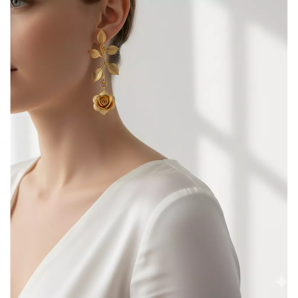 This image shows a pair of very delicate and artistic earrings with a rose and tree leaf design. The design is inspired by nature and has a very luxurious and feminine look.The design is in the form of a branch of a plant with four leaves at the top