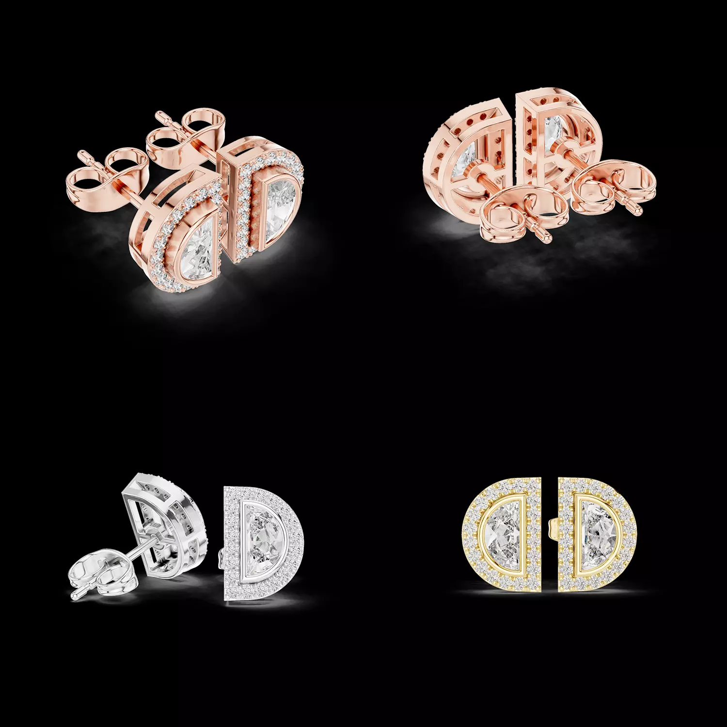 This modern half-moon diamond halo stud earring CAD model features a bold and contemporary design built around a half-moon shaped center stone surrounded by a brilliant diamond halo. The clean geometric structure gives the earrings a strong and luxurious appearance, making them ideal for modern fine jewellery collections.