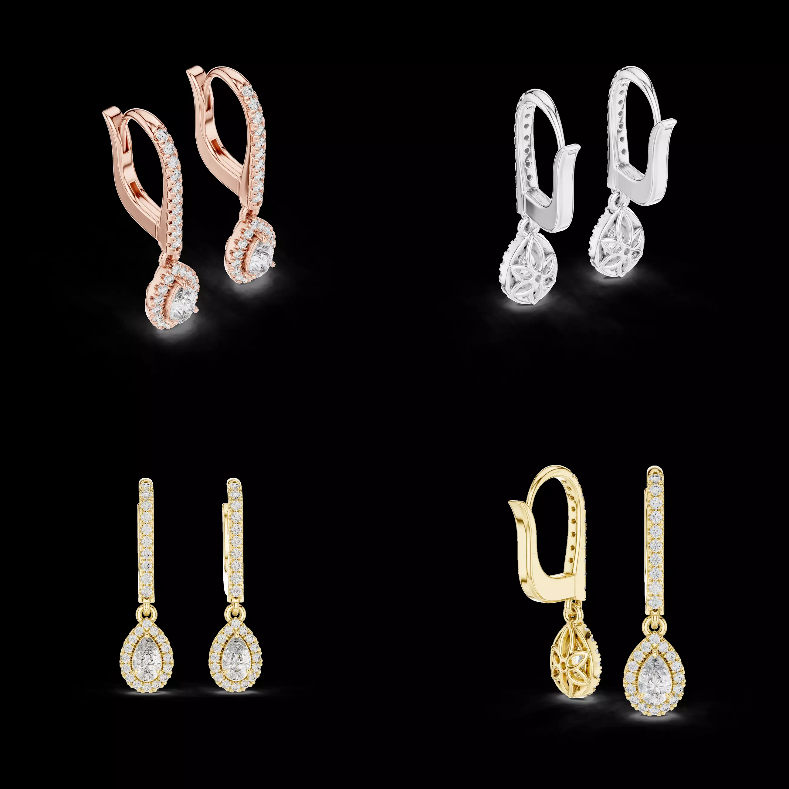 This refined halo teardrop diamond earrings CAD design combines a classic pear-shaped drop with a delicate halo of round stones, suspended from an elegant lever-back structure. The elongated top bar is accented with pave-set stones, adding vertical brilliance and a balanced, luxurious profile.