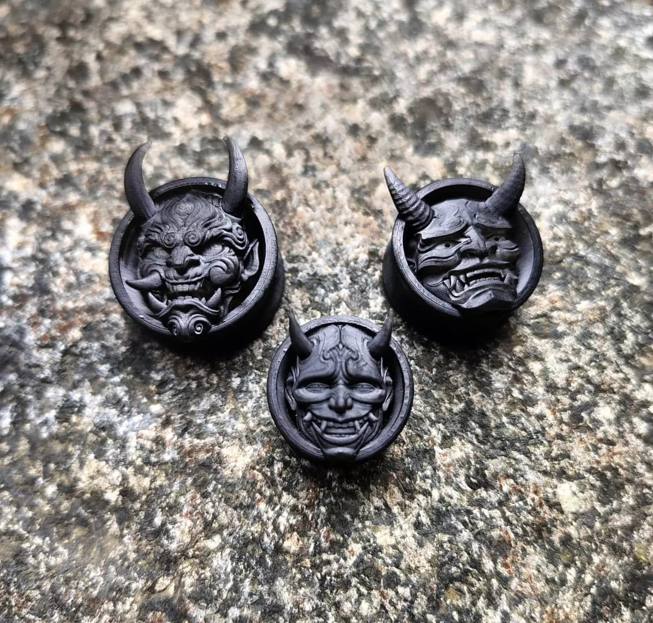 This product is a pack of three different ear gauge tunnel designs inspired by traditional Hannya demon masks. Each tunnel features a unique facial expression, sharp horns, and detailed sculpting, creating a powerful and aggressive aesthetic rooted in Japanese folklore.