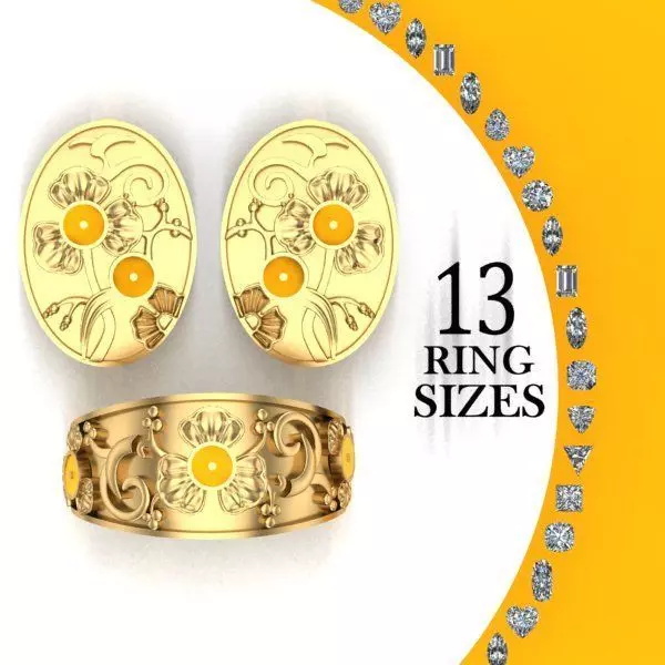 Hello friends!I offer you models of jewelry. Files are checked for errors by Magics, and ready for prototyping - 3D printing or CNC milling. All of the parameters are shown in the pictures.Finger size diameters (mm): from 17.0 to 23.0 in increments of 0,5 mm.The weight earrings with lock - 6.42g (14K).The weight ring in 14K gold is from:D17 - 6.77gD18 - 7.00gD19 - 7.28gD21 - 7.82gD22 - 8.11gD23 - 8.34gAll models are in one .3DM / .STL / .OBJ / FBX file.Note - all models are in one file. If you don't have spetial 3d soft and got a problem to separate one from massive - see my tutorial for it: https://www.cgtrader.com/tutorials/4799-how-to-separate-one-model-if-there-is-massive-in-one-fileYou can order cnc milling of this model in casting wax on the 5-axis cnc machine. Sending from Warsaw.Good shopping for you.