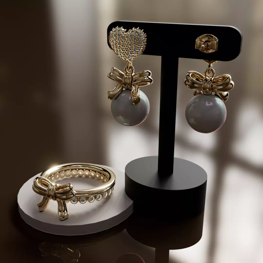 -EarringsA stunning pair of polished gold earrings featuring a heart-shaped stud encrusted with diamonds, adding intense sparkle and a romantic touch. Suspended below is a 3D sculpted gold bow, gracefully holding a luminous iridescent pearl that reflects soft hues — a perfect balance between classic elegance and modern design.