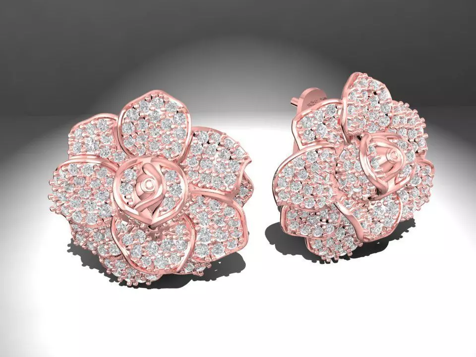 This 3D model features a pair of luxury flower earrings crafted with layered petals fully set in pavé diamonds. Each earring displays intricate detailing that mimics natural floral curves, with sparkling stones covering the petals to create a brilliant and elegant finish. Available in rose gold and yellow gold variations, this design combines femininity, luxury, and timeless beauty.