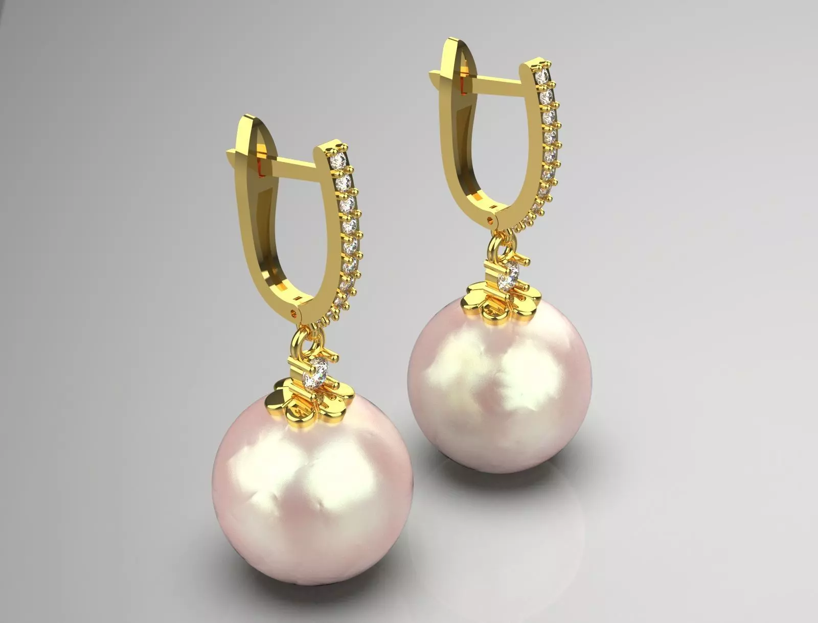 The image features a pair of elegant earrings. Each earring has a golden hoop design, accentuated with small sparkling diamonds along one side. The main component of the earrings is a large, lustrous pink pearl that hangs delicately from the hoop. The overall design exudes sophistication and luxury, making them suitable for both formal occasions and elegant everyday wear.