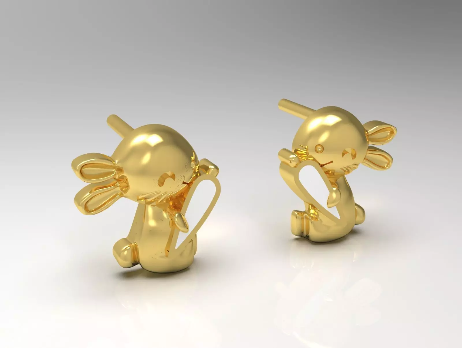 This image shows two small, yellow gold earrings that resemble adorable rabbits. Each rabbit sits upright and appears to be kissing, with a hooves near its mouth. They have large, floppy ears and round bodies, with a shiny, reflective surface that gives them a luxurious, polished look. The background is a clean, light gray that emphasizes the gold sculptures and their beautiful, whimsical design.
