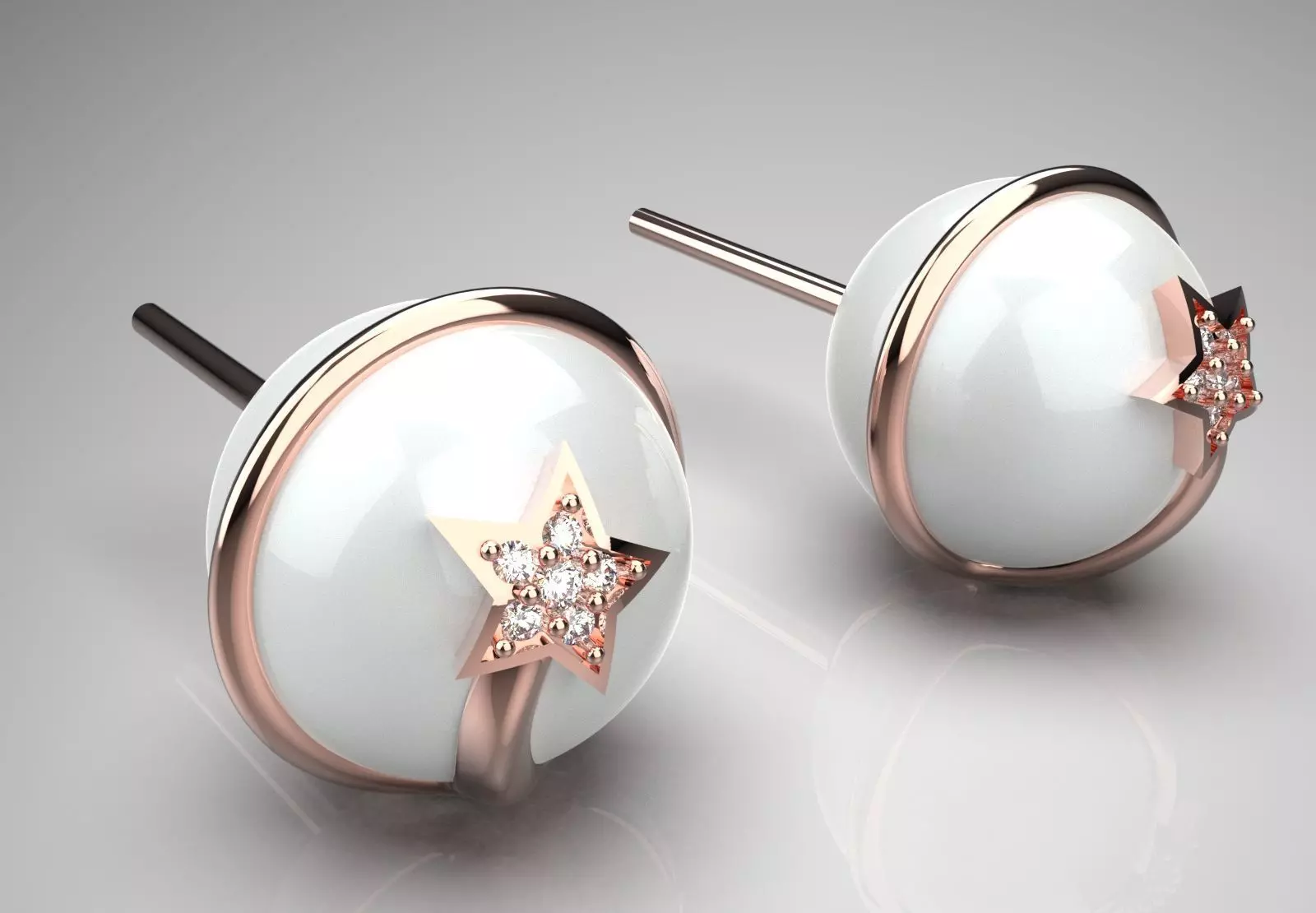 This pair of stud earrings with its unique, hemispherical design consists of a smooth, shiny white surface (possibly pearl, ceramic or enamel) surrounded by a rose gold (or pink) metal band. At the center of each hemisphere is a star-shaped rose gold metal design covered with sparkling diamonds. These earrings are the ideal choice for those looking for a modern, elegant look inspired by celestial designs.