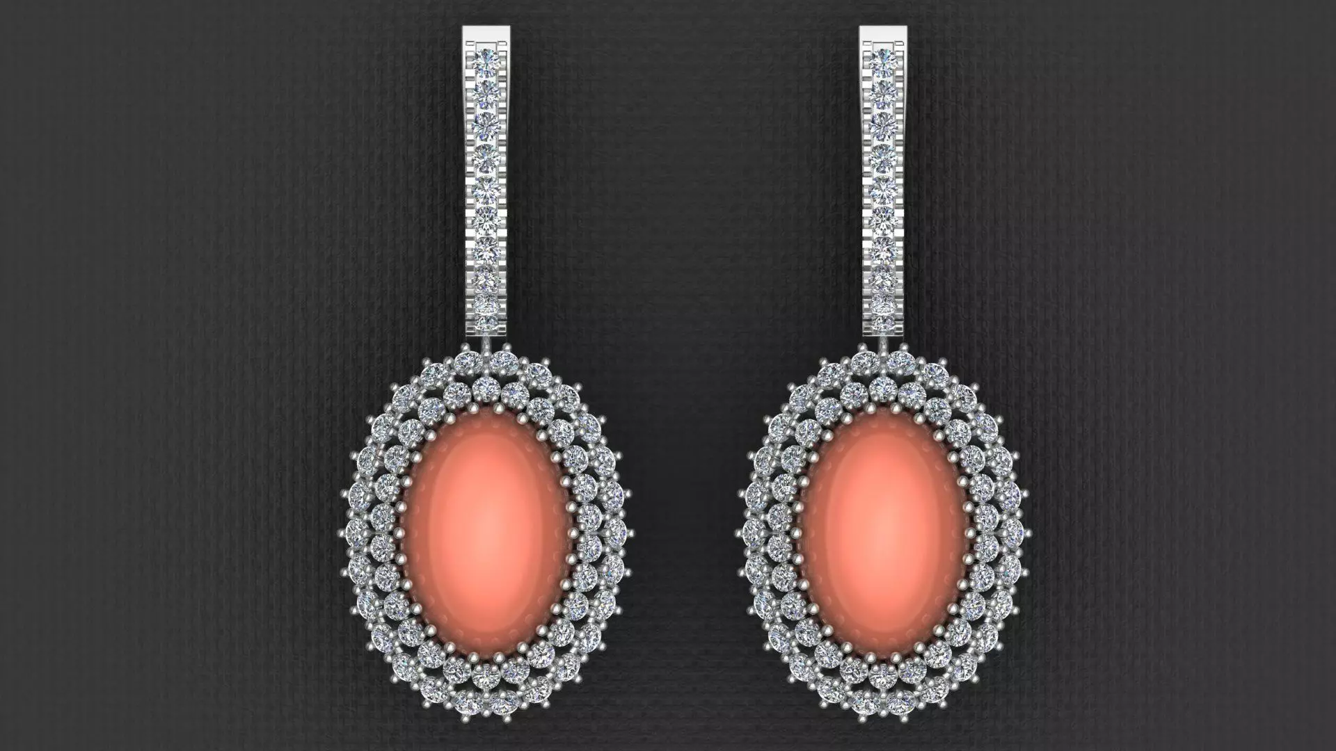 Oval Coral Diamond Fashion Gold EarringWeight: 18k - 8.5 gr 14k - 7.1 grGem Weight: 1.76 CTTotal Gem Count: 124Center Gem Size: 13.8 x 9.55Printable