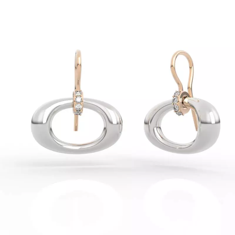 Featuring a polished, dimensional oval pendant, this design showcases the perfect balance of minimalism and elegance. The dual-tone metal composition—rose gold with yellow gold hooks—offers a striking contrast, while the diamond-accented hooks add a touch of refined luxury. The fluid oval shape catches light beautifully, creating subtle yet captivating movement.