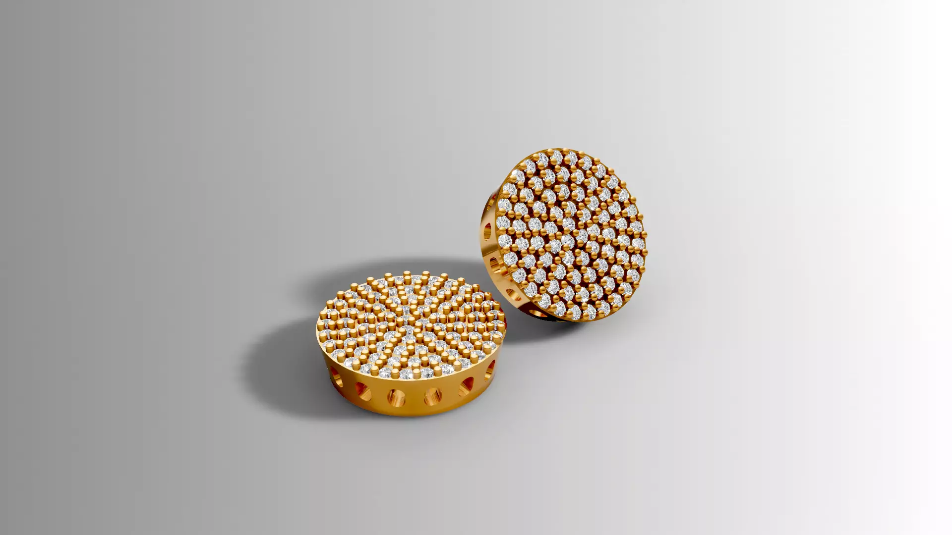 Precisely modeled in Rhinoceros, these round earrings feature a luxurious, highly detailed design composed of a fully pavé-set surface with dozens of micro-prongs, each securely holding brilliant stones arranged in a symmetrical radial pattern. The inner volume includes circular side openings, reducing overall weight and optimizing the piece for real-world production while maintaining structural strength and a premium finish.