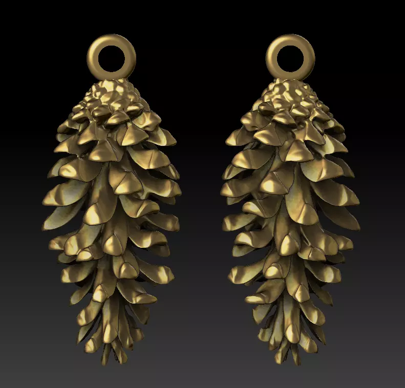 Highly detailed 3D model of botanical pine cone drop earrings, sculpted with layered organic scales to create natural depth and realistic surface rhythm.
