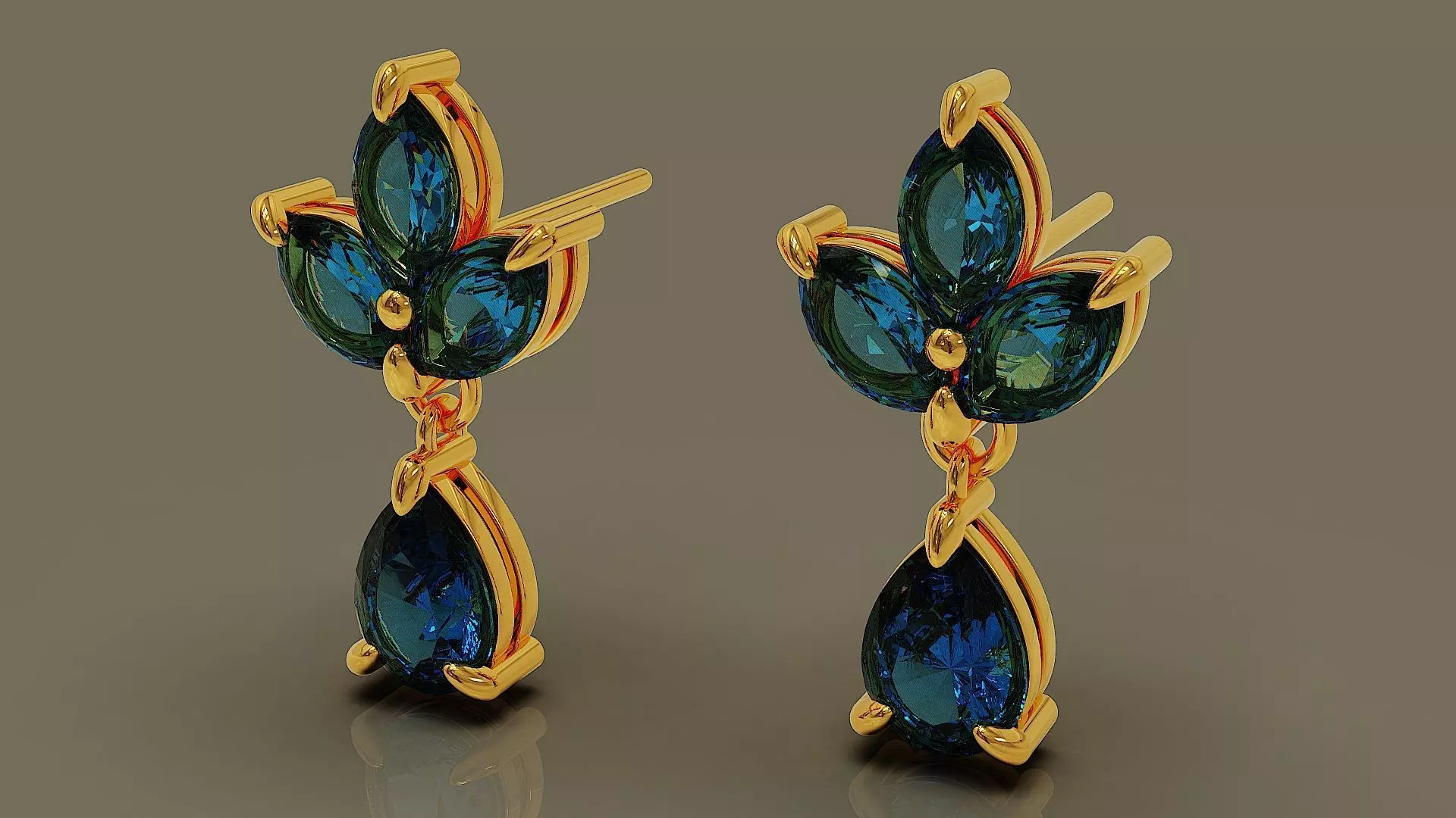 A pair of earrings featuring pear and marquise cut diamonds provides a glistening look that is sophisticated and fanciful. The diamonds are oriented in such a way that it forms a classy accessory that is unique and perfect for your important invitations. The pear diamonds in the piece hang down from a prong set diamond which itself is juxtaposed next to three marquise diamonds that form a leaf pattern. Total weight of earring for all precious metals is shown in pictures. Dimensions of marquise and pear stones are also exist in pictures. In order to have clearer idea of final product in different materials,several materials such as rose gold, whitle gold , yellow gold, diamond, ruby, emerald, sapphire were utilized in rendering process. I invite you to visite other works in my gallery.