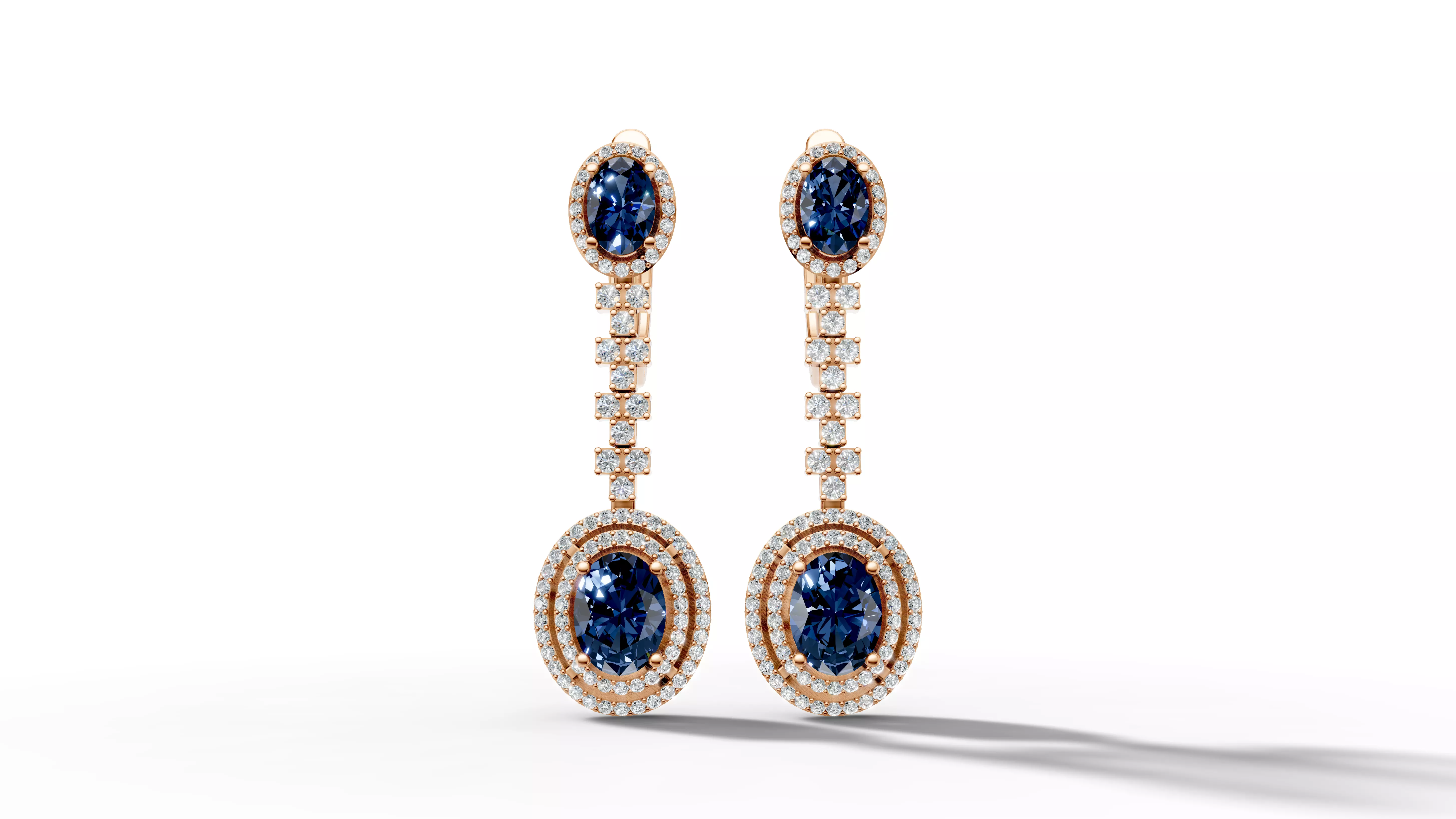 Luxury Sapphire and Diamond Earrings High-Quality 3D Model for Production & RenderingThis elegant 3D model showcases a pair of luxury sapphire and diamond earrings, designed for professional jewelry production, rendering, and visualization. Featuring oval-cut deep blue sapphires as the centerpiece, these earrings are surrounded by a double halo of round brilliant-cut diamonds, enhancing their brilliance and sophistication. The lever-back closure is also adorned with diamonds, ensuring a refined and luxurious look.