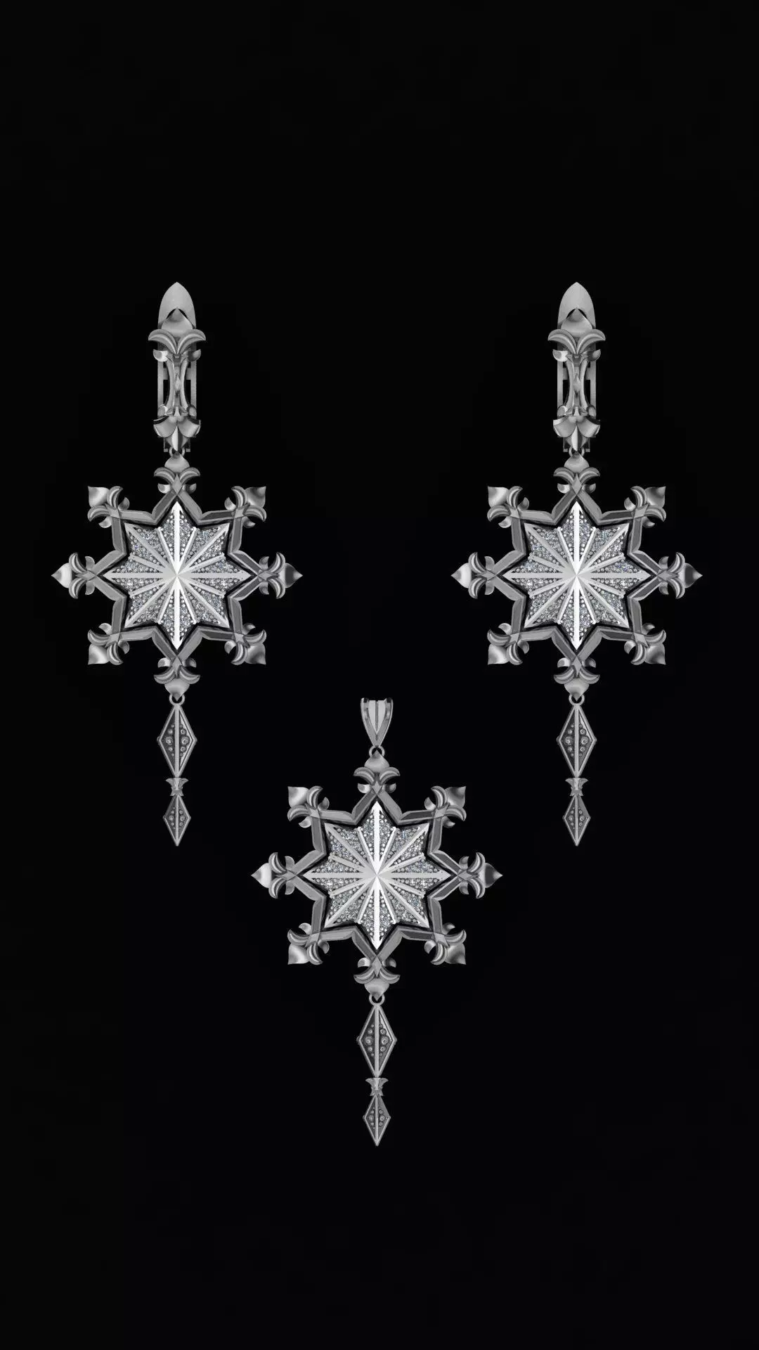 The “Snowflake” pendant and earrings set is a celebration of winter’s elegance and precision. Each piece is crafted with sharp geometric symmetry, echoing the natural perfection of frozen crystals. Accented with shimmering details, the design combines the brilliance of silver tones with a refined architectural aesthetic. This jewelry set transforms the fragile and fleeting beauty of a snowflake into a timeless creation, designed to be worn and admired for years to come.A wearable adaptation of a fantasy design, transformed into real jewelry.The weight of the set and the stones is indicated on the photos.
