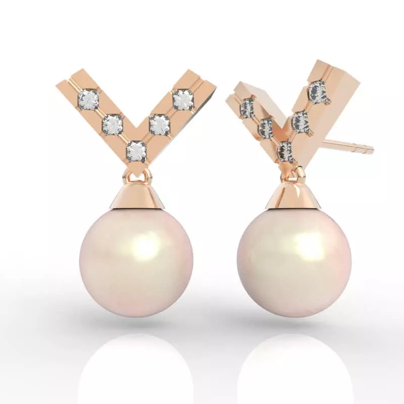 The Chevron Pearl Drop Earrings model was created for jewelers who appreciate the power of clean geometry paired with refined luxury. A bold V-shaped diamond crown leads the design—wide at the top, narrowing with a sculptural taper before meeting a luminous 9mm pearl. The contrast is intentional: sharp architectural lines above, organic elegance below.
