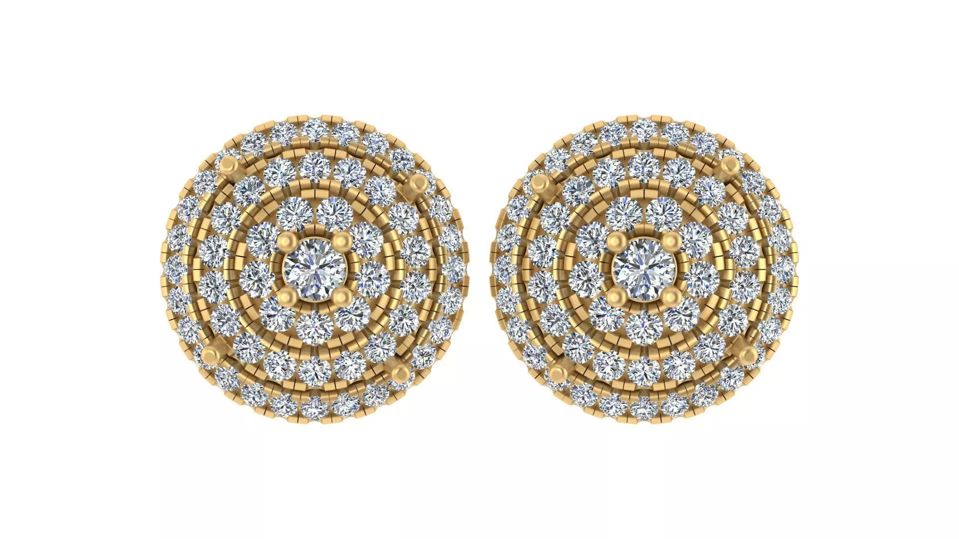Key Specifications:Material Weight (CAD Weight):18K Gold: 8.12 grams14K Gold: 7.15 gramsDimensions:Earring Diameter: 14 mmHeight (Thickness): 5.23 mmPost Thickness: 1.20 mmStone Details:Total Gem Count: 112 diamondsTotal Gem Weight: 1.41 caratsDiamond Sizes:2.80 x 2.80 mm (1 piece, 0.16 ct total) – Center diamond for focal brilliance2.70 x 1.70 mm (3 pieces, 0.33 ct total) – Inner surrounding diamonds for extra sparkle1.50 x 1.50 mm (36 pieces, 0.45 ct total) – Mid-layer diamonds to enhance shine1.30 x 1.30 mm (56 pieces, 0.46 ct total) – Outermost halo setting for a finishing touchDesign Features:Triple-Layered Dome Effect: Gives depth and a high-end luxurious feel.Cluster Setting: Maximizes light reflection for a radiant and brilliant shine.Timeless Elegance: Suitable for both modern and traditional styles.High-Quality Craftsmanship: Perfect for upscale jewelry collections and statement fashion.Comfortable Fit: Designed with a secure post-back for stability and ease of wear.