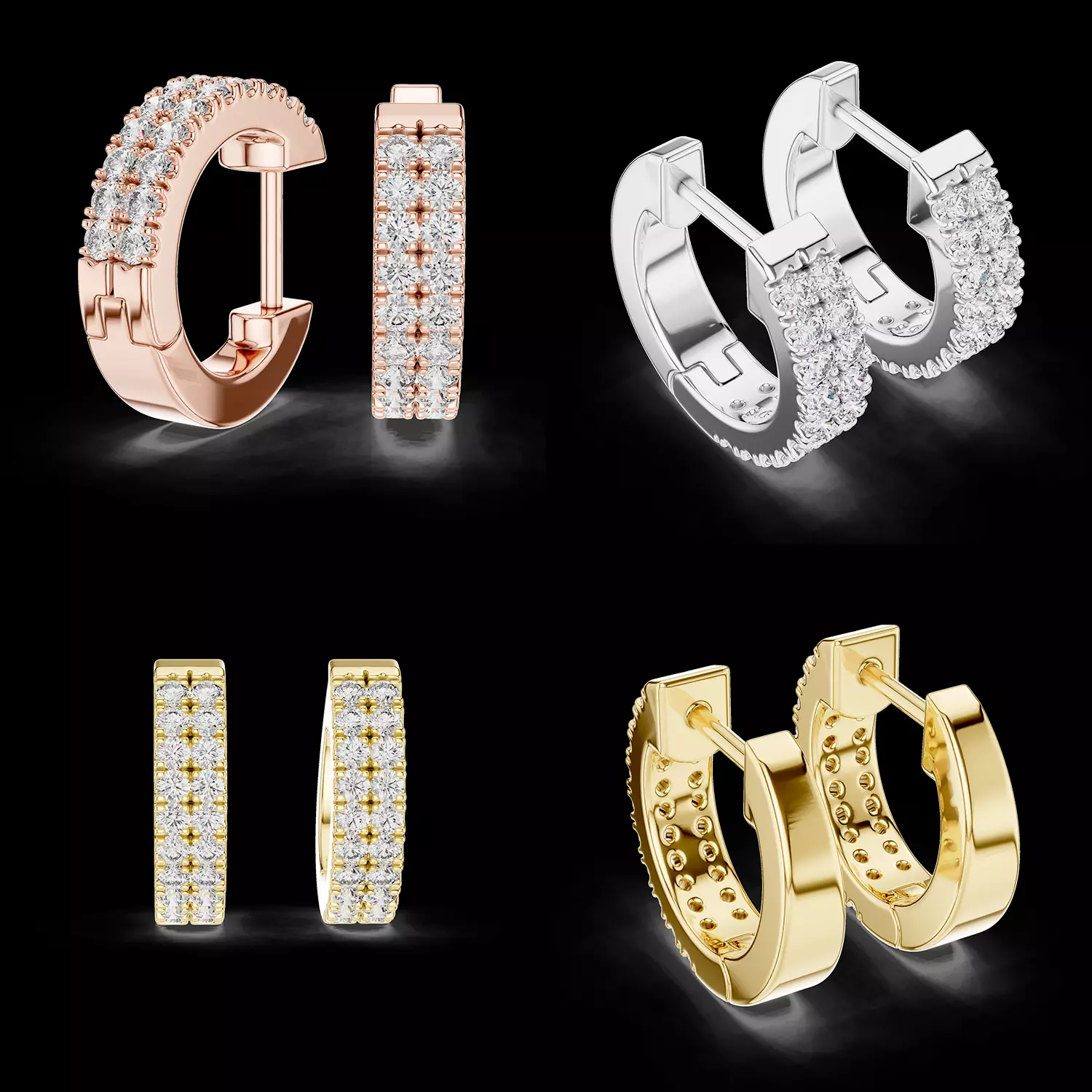 This premium 3D jewelry model showcases a bold hoop earring design featuring three rows of closely set round diamonds. The multi-row arrangement creates a rich, luxurious surface that maximizes brilliance and gives the earrings a strong high-end presence.