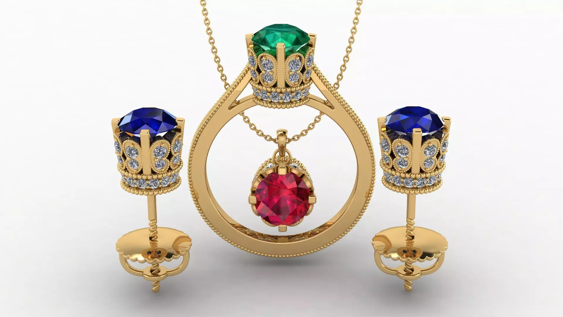 AG ER 0.05 CT EARINGAG PN 0.05 CT PENDENTAG RN 0.05 CT RINGA diamond ring, earring, and pendant set for a wedding and bride is a collection of exquisitely crafted jewelry pieces, each featuring dazzling diamonds, designed to complement and enhance the bride's beauty on her special day. These sets are often chosen for their elegance, timeless appeal, and the brilliant sparkle that diamonds bring. Here are some descriptions of what such a set might entailDiamond Ring The ring could be a classic solitaire with a prominent, brilliant-cut diamond as the centerpiece, symbolizing the singularity and strength of love. Alternatively, it might feature a halo setting, where smaller diamonds encircle the central stone, adding extra sparkle and making the main diamond appear larger. For a more vintage or ornate feel, a ring with pave-set diamonds along the band or intricate detailing could be chosen.Diamond Earrings Bridal earring styles range from delicate studs that offer a subtle sparkle to more elaborate drop or chandelier earrings that make a statement. Diamond studs can be simple and elegant, featuring a single diamond or a cluster of smaller stones. Drop earrings often incorporate dangling diamonds that catch the light with every movement, while chandelier earrings offer a more dramatic and glamorous look with multiple tiers of cascading diamonds. Diamond Pendant The pendant typically features one or more diamonds suspended from a delicate chain. It could be a solitaire pendant, mirroring the ring's central diamond, or a more intricate design with multiple diamonds arranged in a beautiful motif, such as a floral pattern, a geometric shape, or a symbolic design like a heart.The length of the chain is chosen to sit gracefully on the bride's neckline, often complementing the style of her wedding gown. The chain is usually made of the same precious metal as the ring and earrings