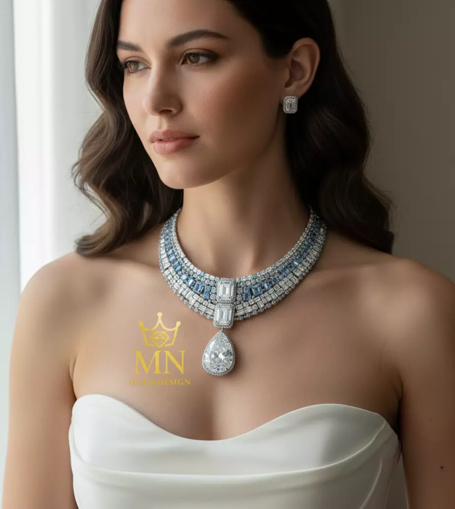 The layered and collared design of this necklace allows it to sit beautifully on the neck and the large teardrop pendant in the center is the main focus and gives the feeling of royal jewelry. This model is fully reproducible in the real world and is ideal for luxury jewelry brands, bridal sets and special collectionsTechnical information and measurementsOverall length of necklace: 400 – 430 mmOverall height with pendant: approx. 55 mmPendant center stone:Cut: Pear Cut Top center stones:Cut: Emerald CutSuggested metal:18K white gold Can be made with platinum or silver for more economical productionType of stones:Diamond Blue topaz / aquamarine (changeable)