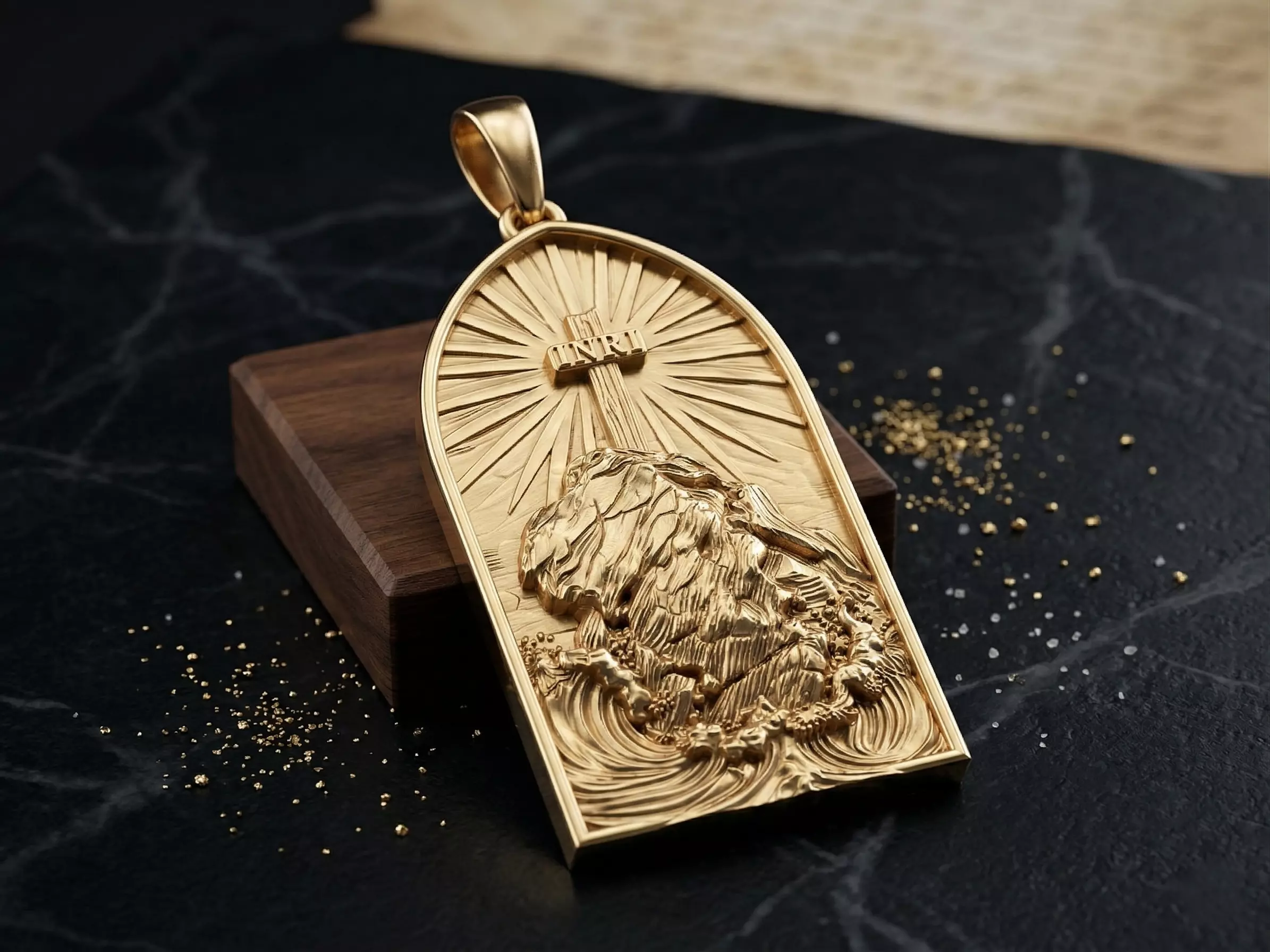 Carry a symbol of unwavering strength with this Faith in the Storm Lion & Cross Pendant. This intricate archway medallion depicts a majestic lion silhouette rising from turbulent ocean waves, anchored by the INRI cross and a radiant sunburst background. It is a masterpiece of religious storytelling, perfect for those seeking a protector spirit or a high-end piece of wearable art.