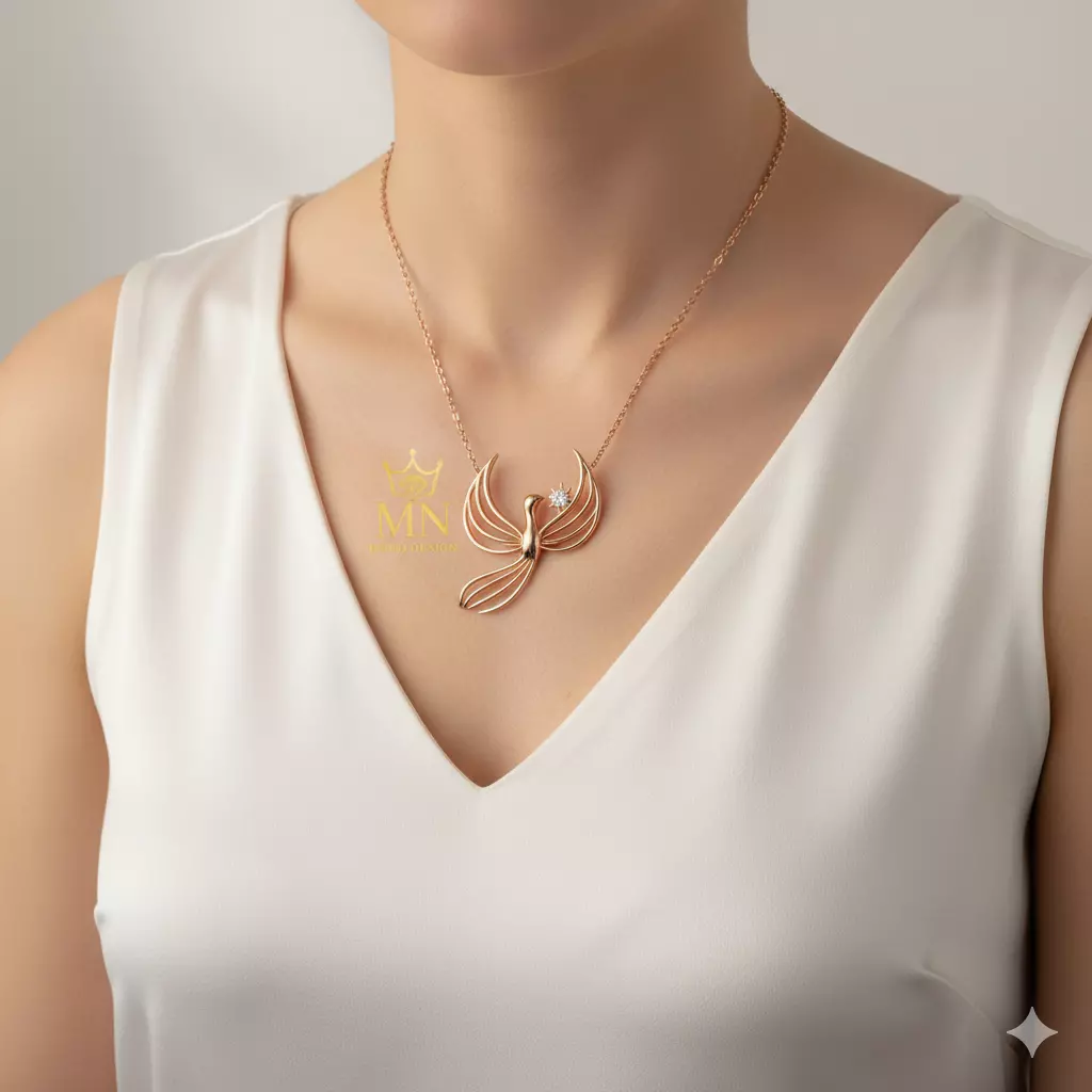 Embodying the spirit of rebirth and grace, the Phoenix Light Necklace is a masterpiece of modern jewelry design.Crafted in 14K rose gold, this pendant captures the fluid motion of a phoenix rising — its wings gracefully open as it holds a brilliant-cut diamond near its beak.