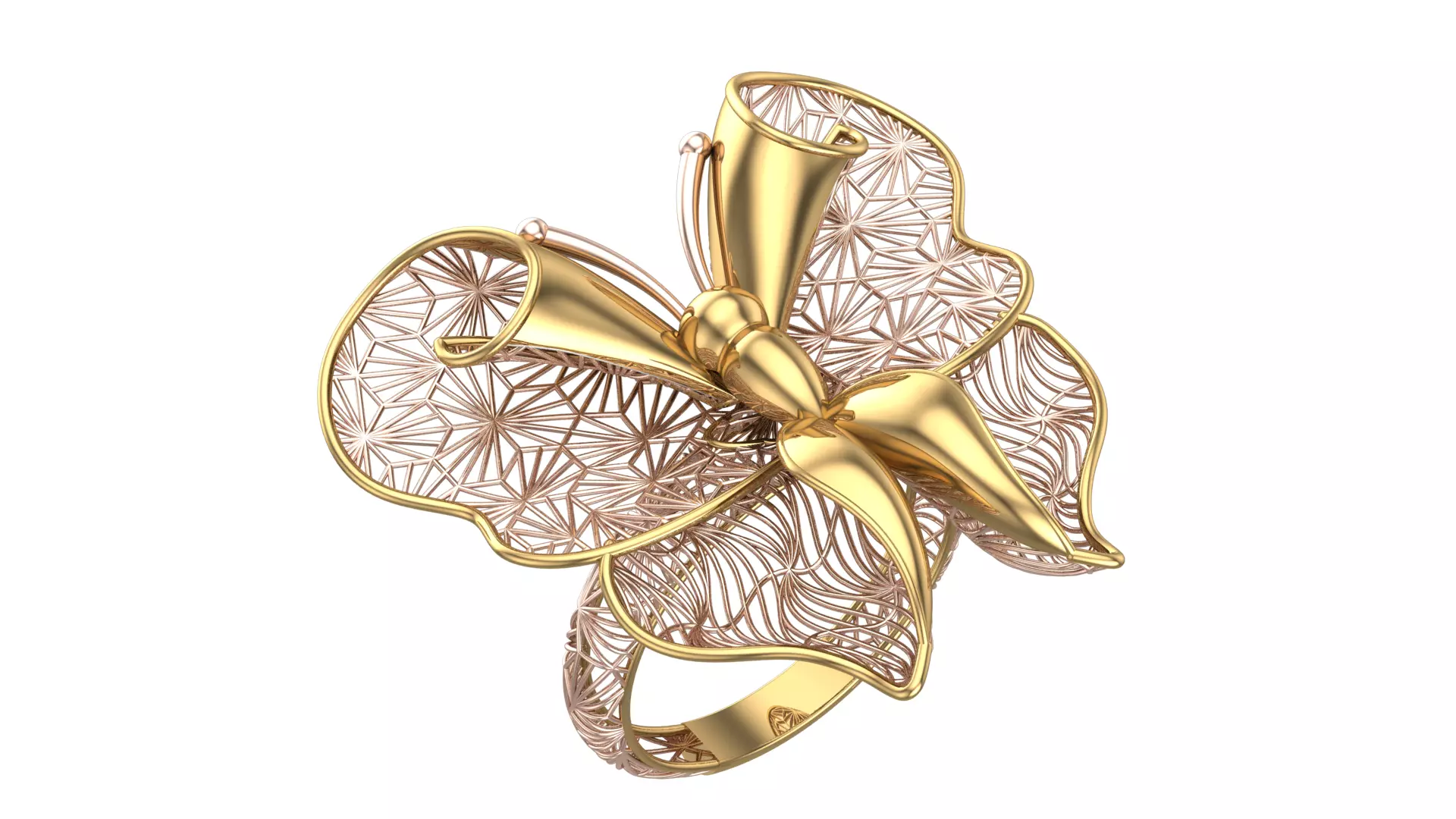 Design Theme: - Nature-inspired butterfly form - Fine filigree structure & modern lines - Rendered in gold and rose tones