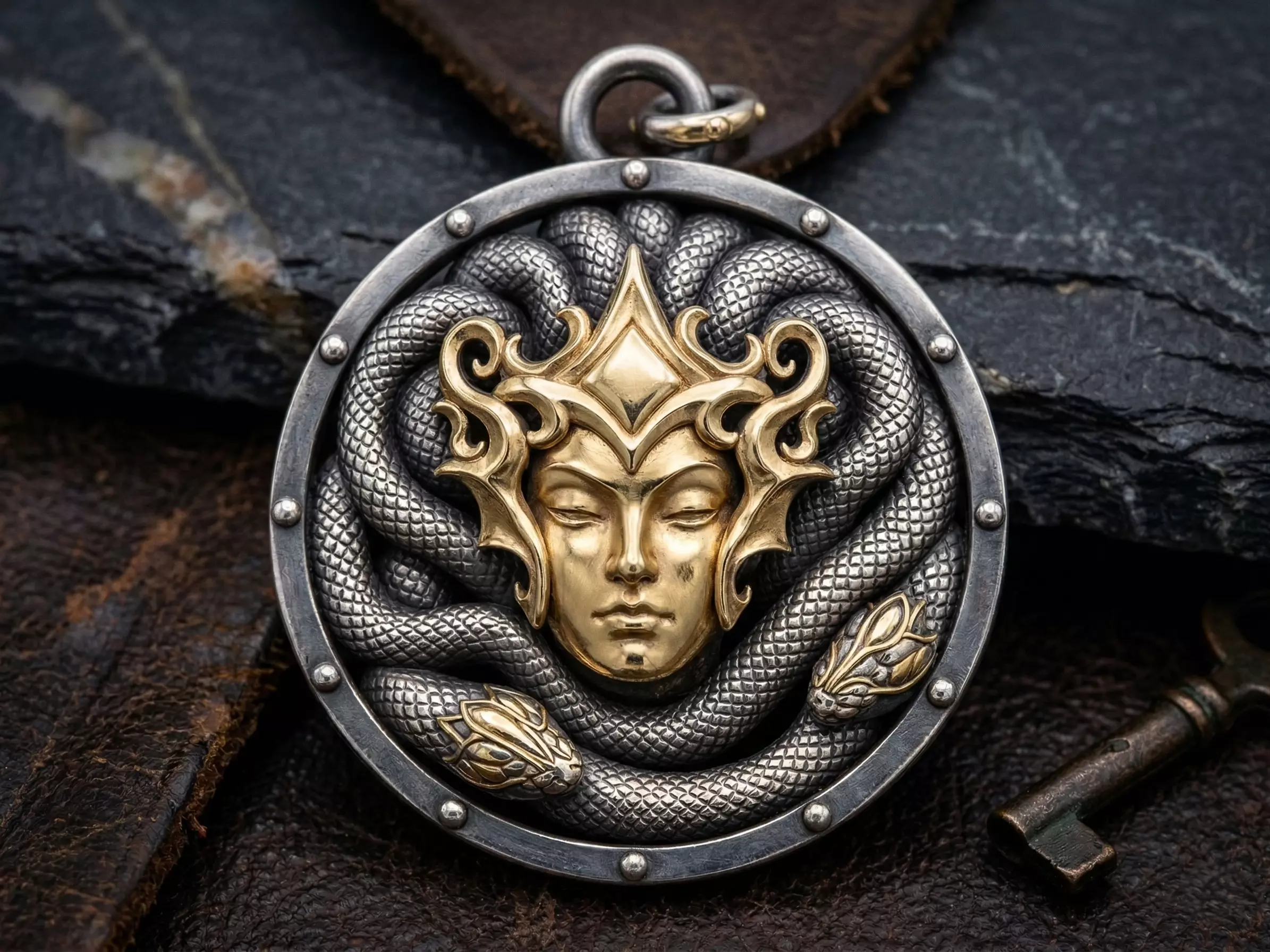 Command attention with the gaze of the Gorgon Queen Medusa Medallion. This design features a serene, crowned Medusa face surrounded by a nest of intricately scaled serpents, all enclosed within a studded shield frame. It is a powerful symbol of protection and feminine strength, perfect for high-end pendants, fashion medallions, or collector’s pieces.