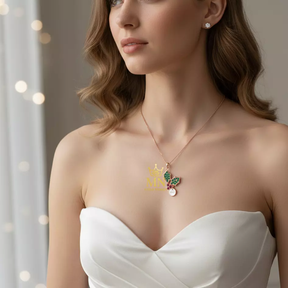 This beautiful pendant necklace is inspired by the symbols of Christmas and Yalda Night, featuring holly leaves adorned with emerald green stones and vibrant red ruby berries. At the bottom of the design, a small round charm engraved with the word Noël (French for Christmas) made from mother of pearl adds a unique, festive touch. Crafted in rose gold, this necklace is the perfect gift for Christmas, Yalda, or any special occasion.