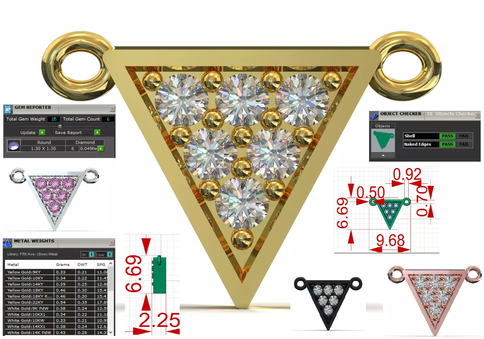 - Diamond Facet: The interior of the triangle is completely covered with nine Round Brilliant Cut gemstones.