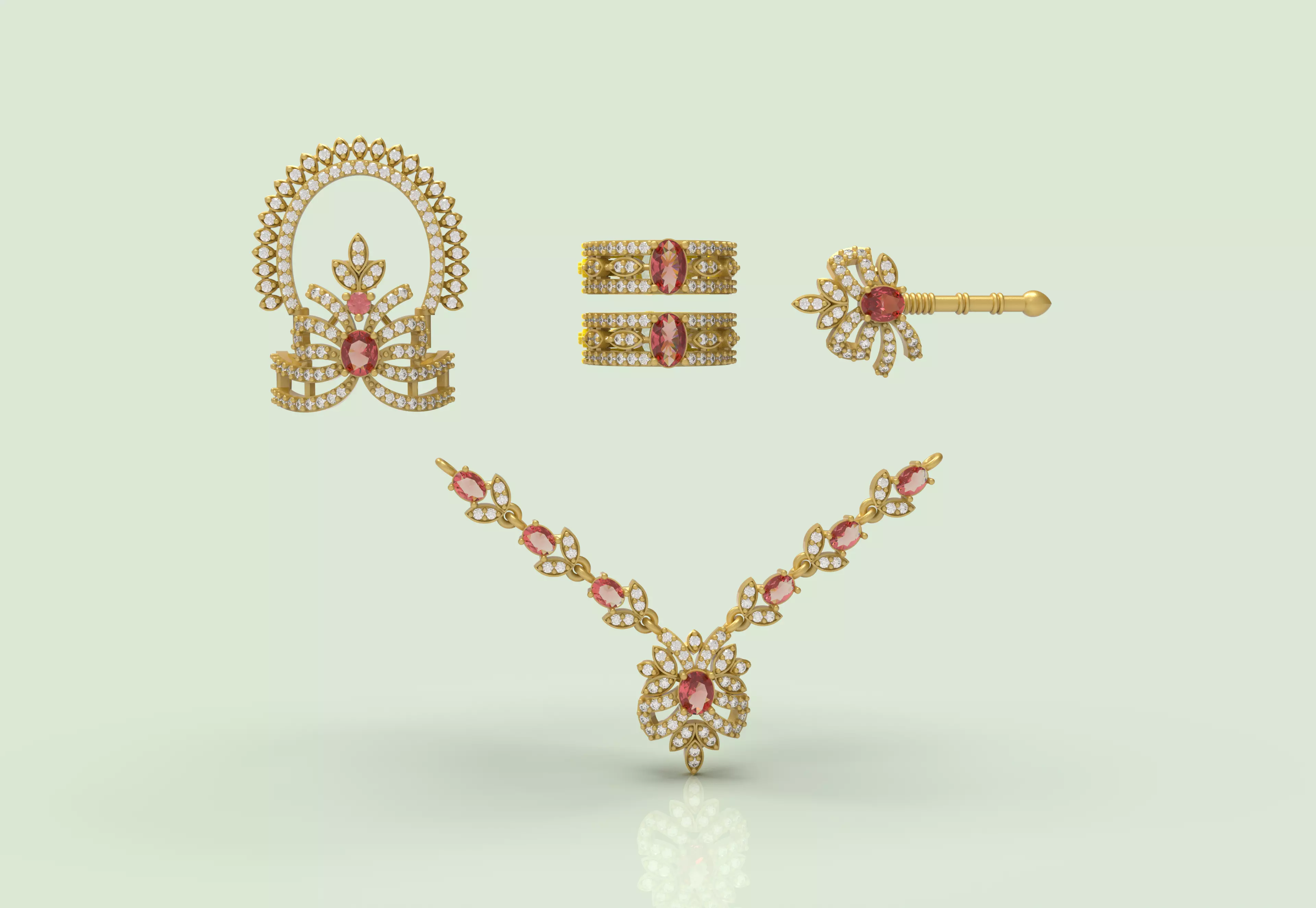 This is a jewelry CAD file or 3dprint file or stl file. For jewelry CAM and casting. Model name is :- ”Krishna Shringar Combo Set - 02“.The crown is the pride of our deities. Stone crown to adorn Lord Krishna and other deity, the diamond crown is made in multi Colourful stone .A very beautiful crown made to decorate the idol of God. In ancient times, the kings also kept their crown very carefully, and with the crown, all the people used to salute the king. The crown has a special significance. The crown is seen as a special decoration to adorn the Lord in the temple of the Lord and to tie it on the head , a place has been made to tie the thread on both sides of the crown. It represents power ,legitimacy ,victory ,triumph , honour , and glory, as well as immortality , righteousness ,and resurrection.In addition to the crown, it also includes a necklace, bangles, and flute. This”Krishna Shringar Combo Set - 01“ is ready for jewelry CAM and casting or any type of 3D-printing. You can find all details of the product in product image. I give you (stl, 3dmstl and obj ) file format in zip file.