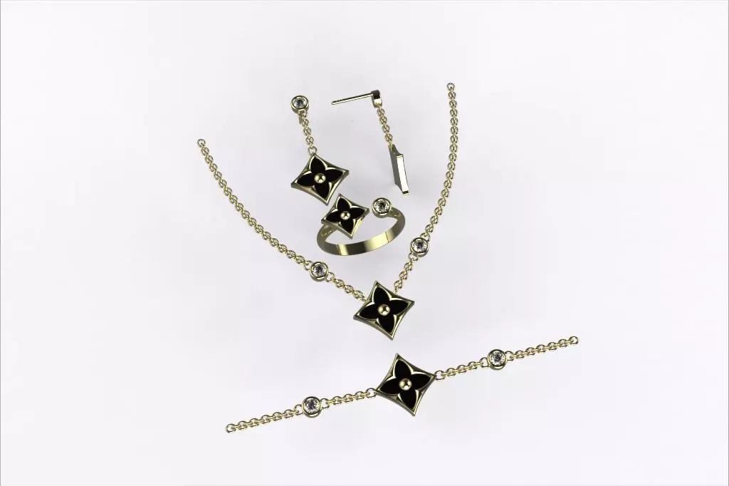 This luxurious 3D jewelry set is inspired by the iconic Louis Vuitton monogram flower motif—an emblem of timeless French elegance. Crafted in radiant 18K yellow gold, each piece—necklace, bracelet, earrings, and ring—features a stylized quatrefoil flower accented with pavé diamond details. The harmonious blend of classic form and high fashion aesthetics makes this set ideal for refined luxury collections. Designed for high-resolution rendering or 3D printing, it’s a perfect tribute to heritage design with a modern twist.