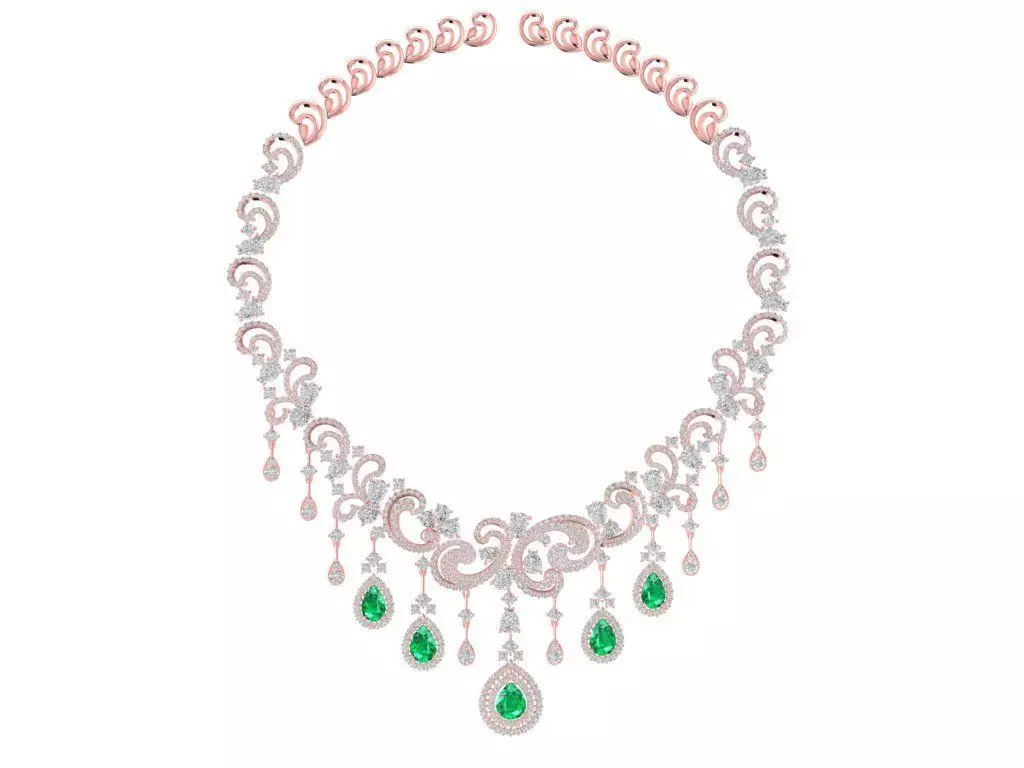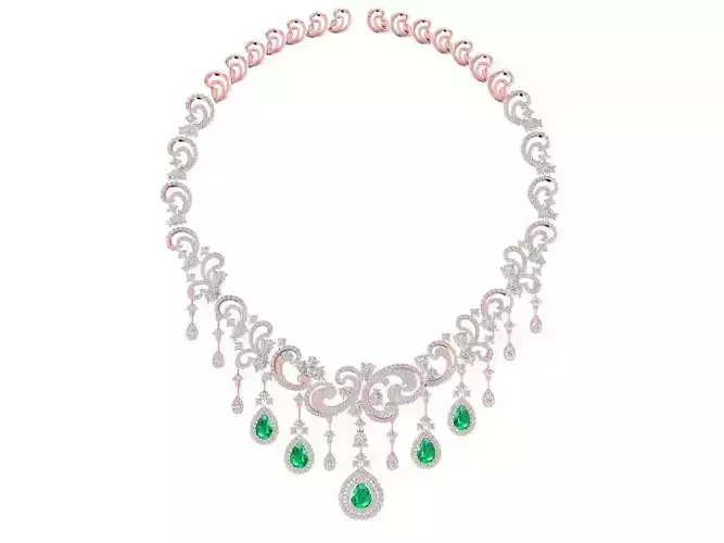 This necklace model is ideal for fine jewelry brands, bridal collections, ceremonial pieces, or designers seeking an ornate statement accessory. The combination of scrolling elements and dangling gemstones gives the piece movement, brilliance, and a premium handcrafted appearance. Perfect for customization or integration into a luxury product line.