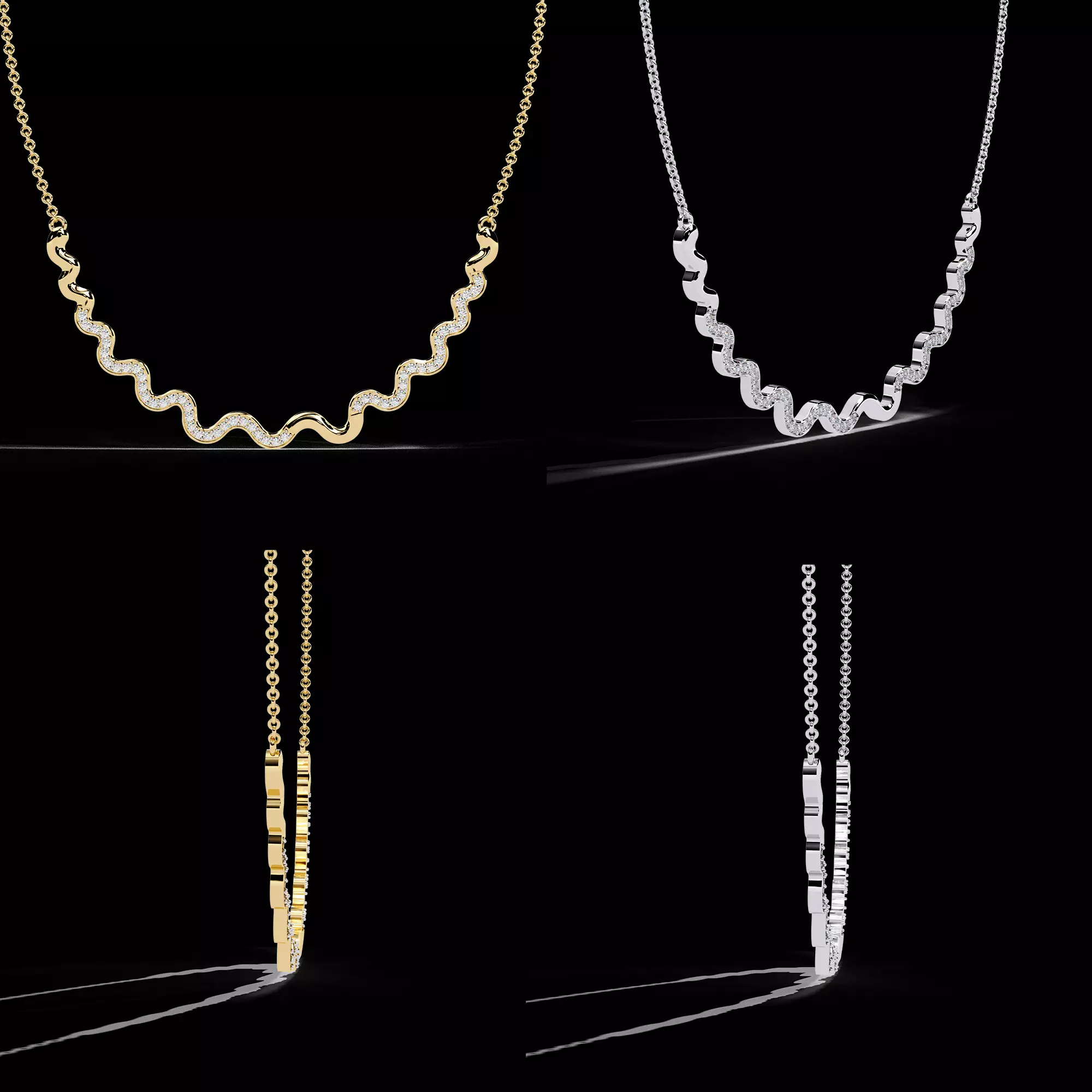Elegant wavy and zig-zag inspired central necklace patternSmooth flowing curves designed for natural neckline alignmentDiamond detailing evenly placed along the wave structureBalanced thickness for durability and premium appearanceClean CAD topology for smooth casting and finishingOptimized proportions for comfort and visual symmetryProfessional jewellery manufacturing ready design