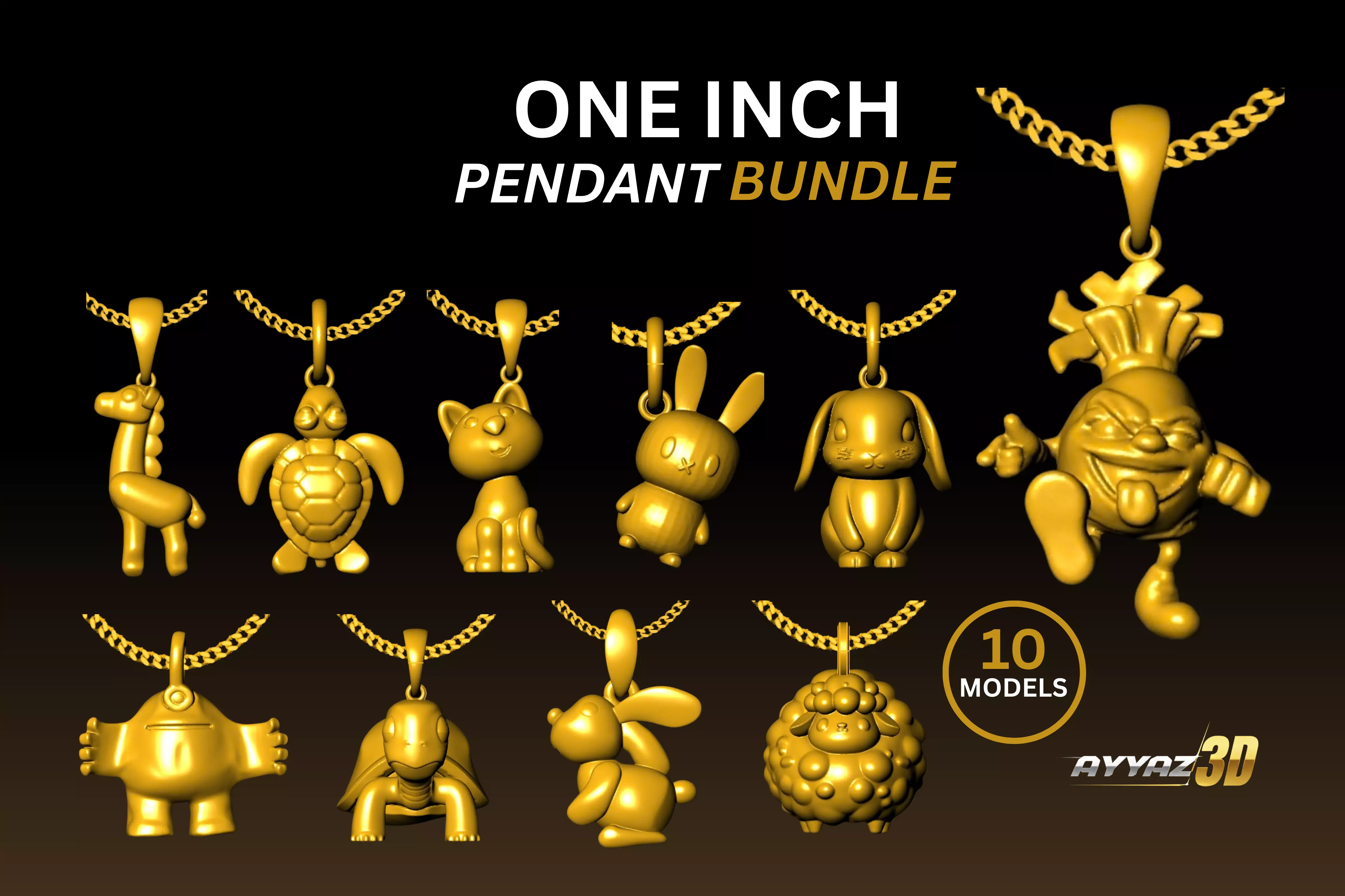 A collection of 10 cute animal-themed one-inch charm pendant designs created for jewelry making and 3D printing.This bundle includes adorable cartoon-style animal characters that are perfect for necklaces, charm bracelets, and custom jewelry collections.