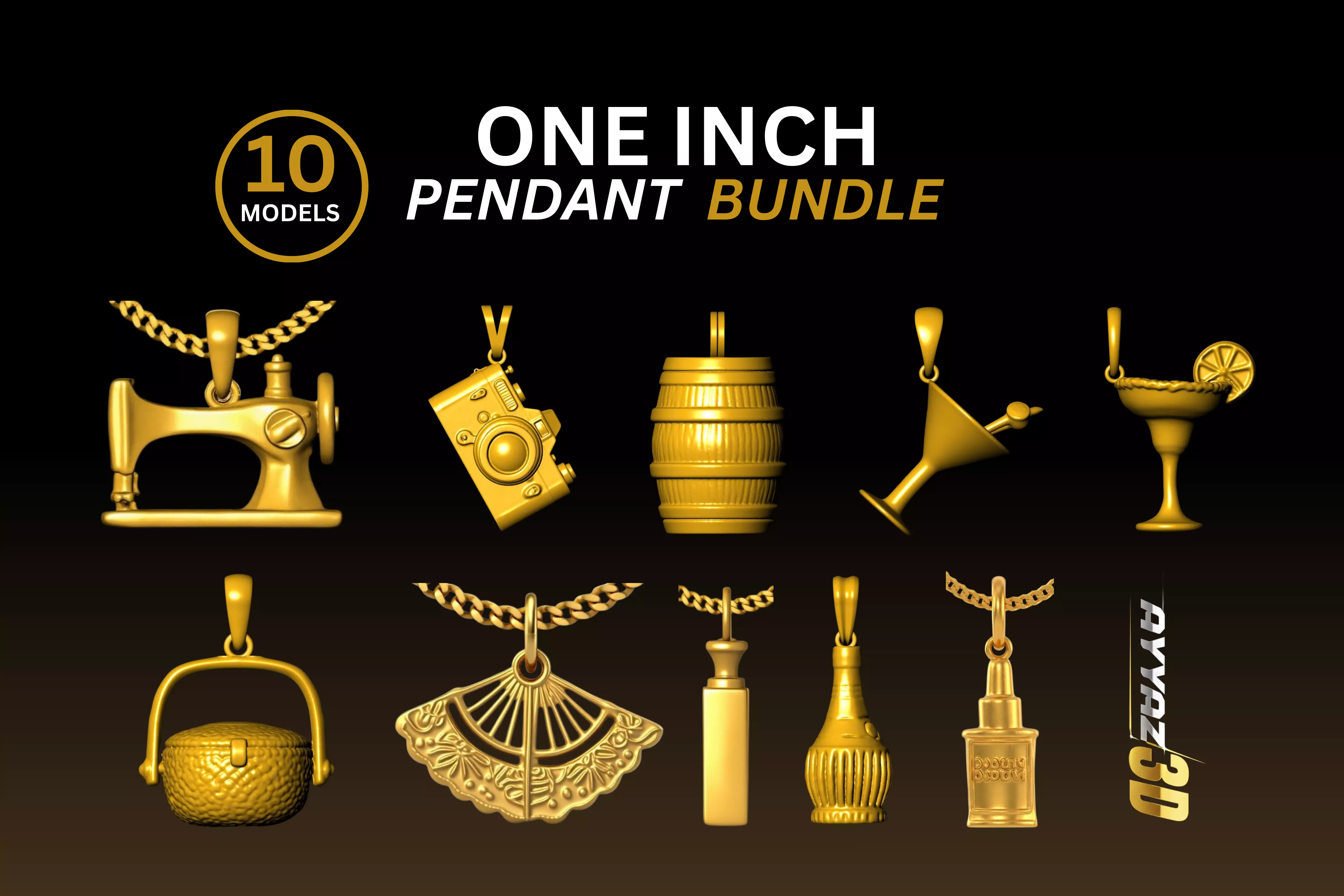 A collection of 10 vintage-style one-inch charm pendant designs created for jewelry making and 3D printing.This bundle features classic retro objects including a sewing machine, camera, barrel, cocktail glass, perfume bottles, and decorative accessories. These detailed pendants are perfect for necklaces, charm bracelets, and creative jewelry collections.