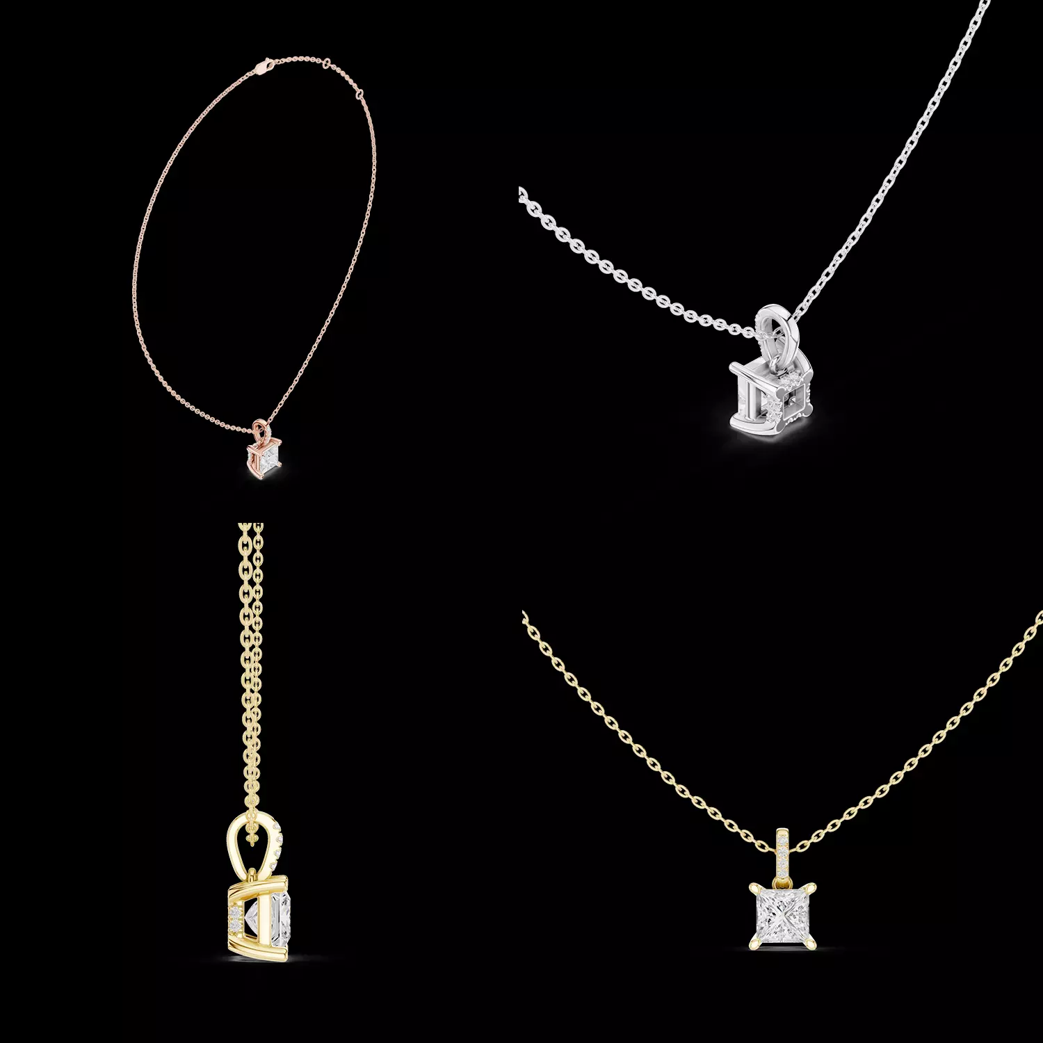 The center stone is held securely in a four-prong setting that highlights the clean square shape of the diamond while allowing maximum light exposure. This open structure enhances the brilliance of the gemstone and ensures the pendant maintains a delicate yet durable construction suitable for everyday wear.