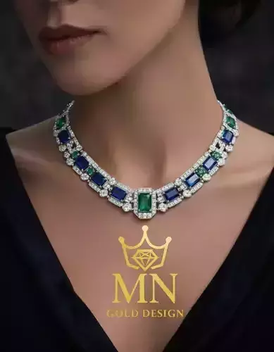 The Royal Azure & Emerald Necklace is a timeless luxury jewelry design inspired by classic royal elegance.This sophisticated necklace features a harmonious combination of emerald-cut blue sapphires and vivid green emeralds, framed by brilliant round diamonds that enhance sparkle and depth.