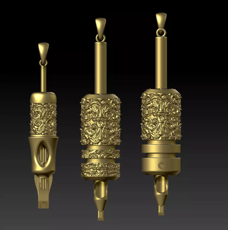 his tattoo needle pendant 3D model set includes three distinct tattoo needle designs, each featuring a unique tip structure inspired by real tattoo machine needles.The bodies of the pendants are decorated with highly detailed ornamental engravings, sculpted with sharp edges and deep relief to ensure clarity after casting and polishing.