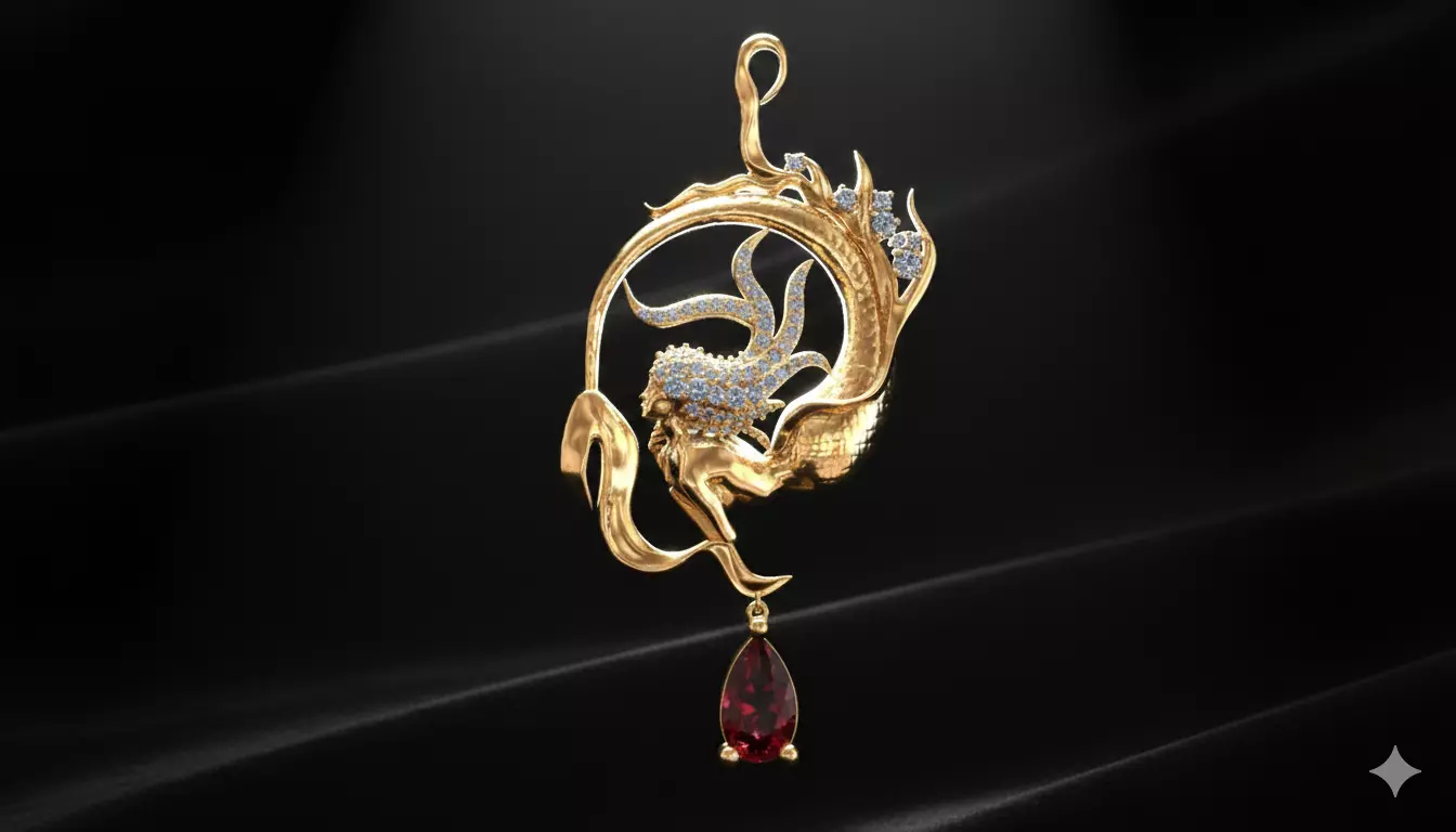 An exquisite fusion of myth and luxury, this pendant captures the ethereal grace of a mermaid entwined in a celestial dance. Crafted from gold and silver and pavé-set with brilliant-cut diamonds, the piece is anchored by a majestic, teardrop gemstone. It represents the untamed beauty of the deep sea meeting the fiery brilliance of the sun—a true statement of power, elegance, and avant-garde artistry.