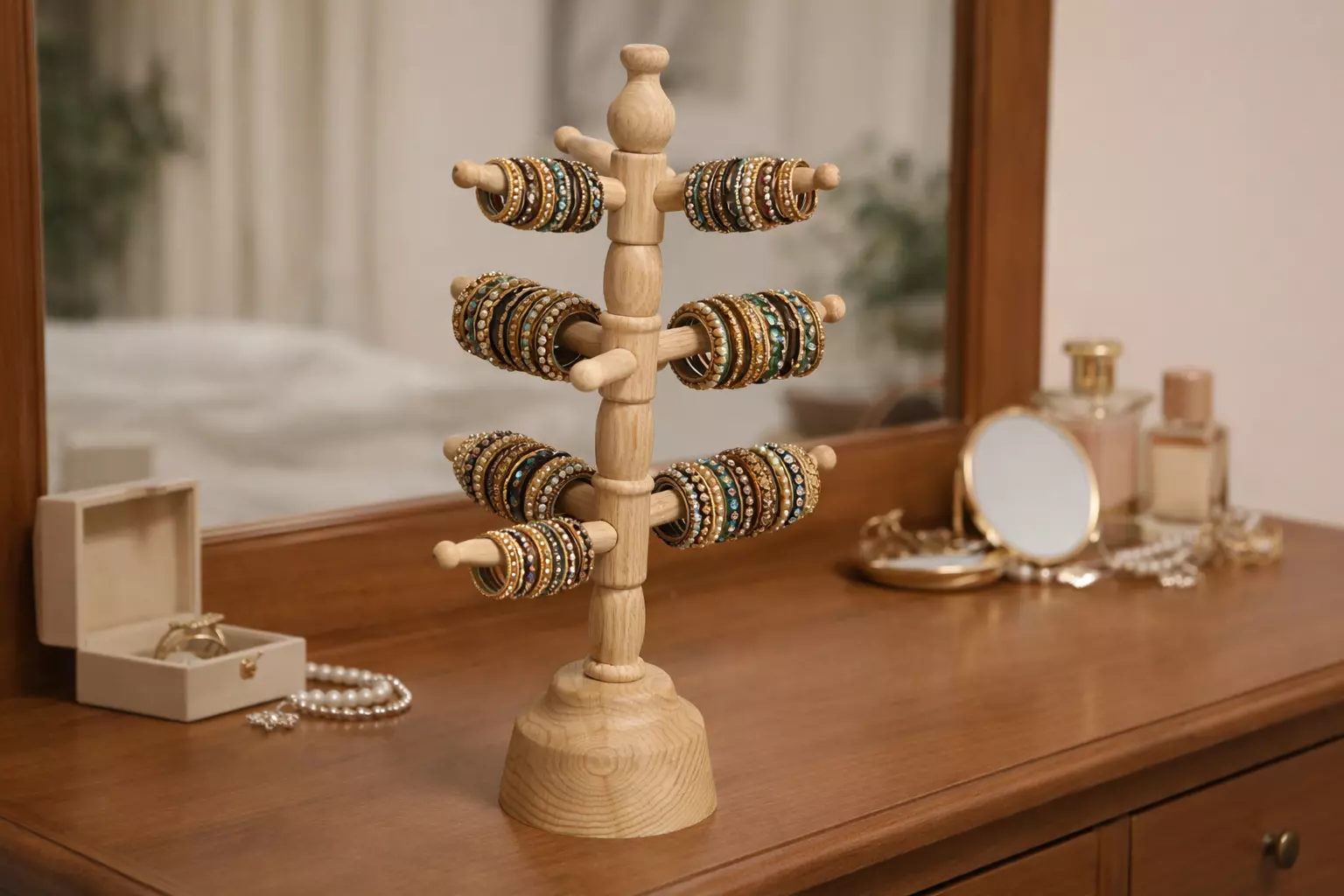A stylish and functional bangle holder designed to organize bangles, bracelets, and kada in an elegant way. The design features multiple horizontal rods mounted on a central vertical stem, allowing bangles to slide neatly and rest close to the center for a balanced, aesthetic look.