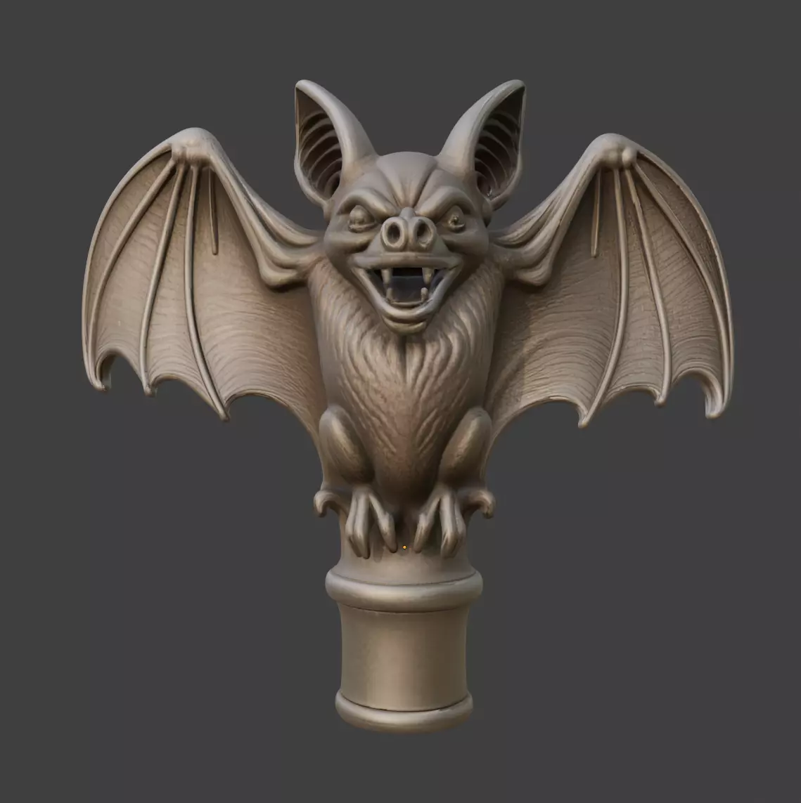A dramatic cane topper shaped like a bat in flight, with outstretched wings and carved detail. Ideal for gothic fashion, Halloween costumes, vampire-themed characters, or collectors of dark fantasy props.