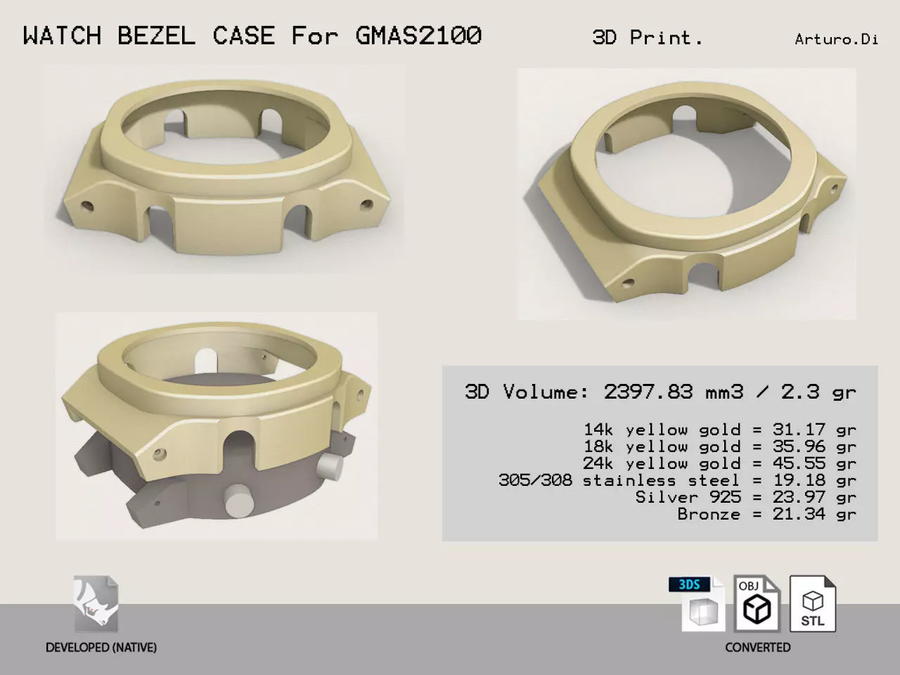 Available on files: Closed Mesh model of the Bezel for 3d print. [.STL .OBJ .3DS] Closed Polysurface (WaterTight Model) + Mesh. [.3dm]