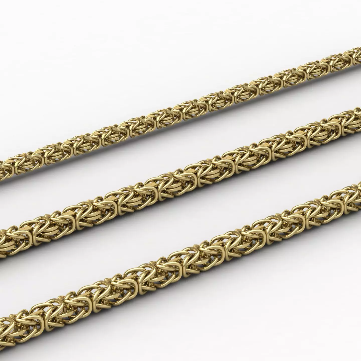 Byzantine chain in 3 sizesThe designed chain can be used in various applications, including jewelry design, clothing, accessories or even use in 3D decorative objects. The structure of this chain is designed to maintain the ability to bend and flex in the natural direction of movement without reducing the accuracy and elegance of the model.The difference between these chains is in the number of links and their cross-section.Each piece is carefully designed and individually modeled to create a harmonious, strong and beautiful structure.The exact dimensions of each chain component are specified in separate images and can be checked. This feature allows designers and manufacturers to adjust and customize the chain to suit the specific needs of their projects.The length of the chain is approximately 300 mm, which can be increased or decreased.The files are prepared with high precision and cleanliness to be used directly in 3D projects, rendering or physical construction (with 3D printing or industrial production).