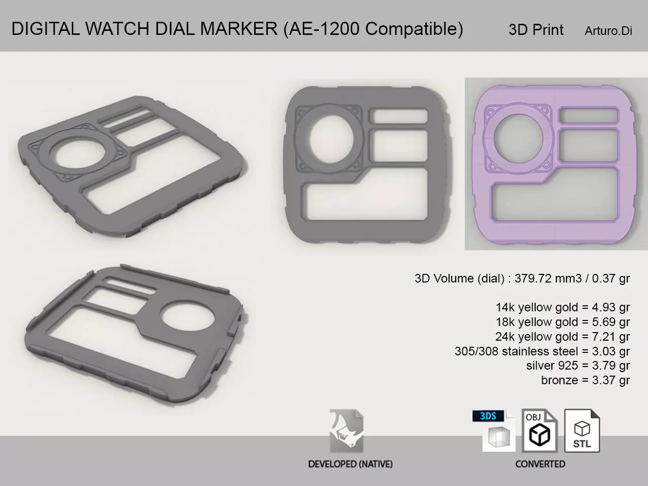A watch dial compatible with the classic Casio Royal AE-1200. With a 3d volume of 380 mm3 or 0.38 gr (for casting purposes)
