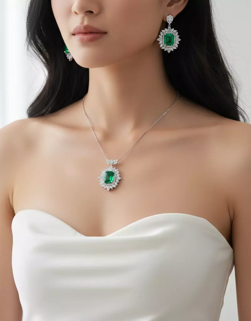 This stunning jewelry set is a perfect blend of elegance and sophistication. Featuring a radiant emerald centerpiece surrounded by delicate diamond-like stones, this necklace and earring set will add a touch of luxury to any special occasion. With its timeless design, it's ideal for weddings, anniversaries, or formal events, making it a true masterpiece in every sense.Materials:Necklace:Main Stone: Emerald (Lab-created or natural depending on preference)Accent Stones: White cubic zirconia or simulated diamondsChain: 925 Sterling Silver or 14k White GoldEarrings:Main Stone: Emerald (Lab-created or natural)Accent Stones: White cubic zirconia or simulated diamondsDimensions:Necklace:Length: 18 inches Pendant Dimensions: 2.5 cm x 2.5 cm Earrings:Length: 2.5 cmWidth: 1.5 cm